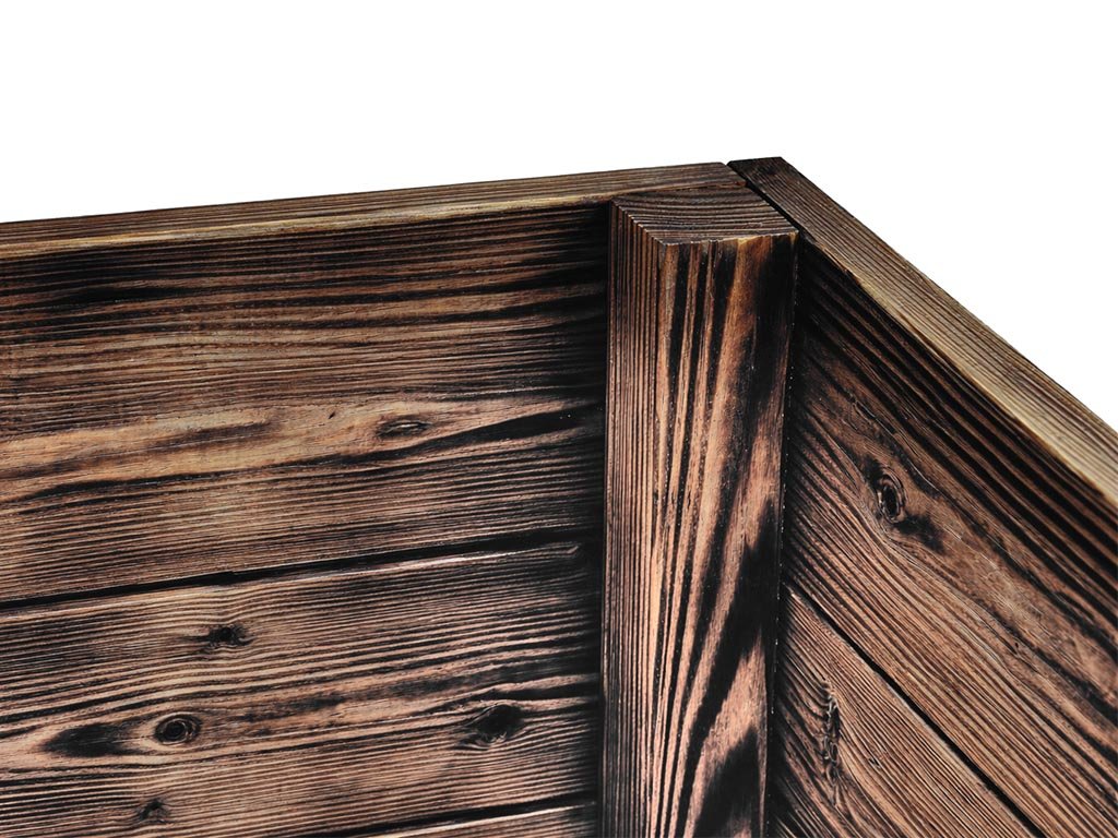 Durch das Abflammen des Holzes wird der Schutz vor äußeren Witterungseinflüssen erhöht; zudem ist das Beet widerstandsfähiger gegen holzzerstörende Pilze und Insekten. Während der gesamten Lebensdauer des Produkts ist kein Anstrich mit Schutzmitteln erforderlich.