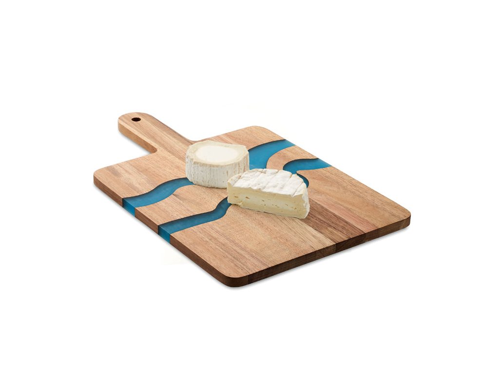 Das Küchenbrett wurde aus einer Kombination aus Akazienholz und blauem Epoxidharz hergestellt. Auf den ersten Blick besticht es durch sein originelles Aussehen und beeindruckt mit Funktionen, die es zu einem nützlichen Helfer in jeder Küche machen.