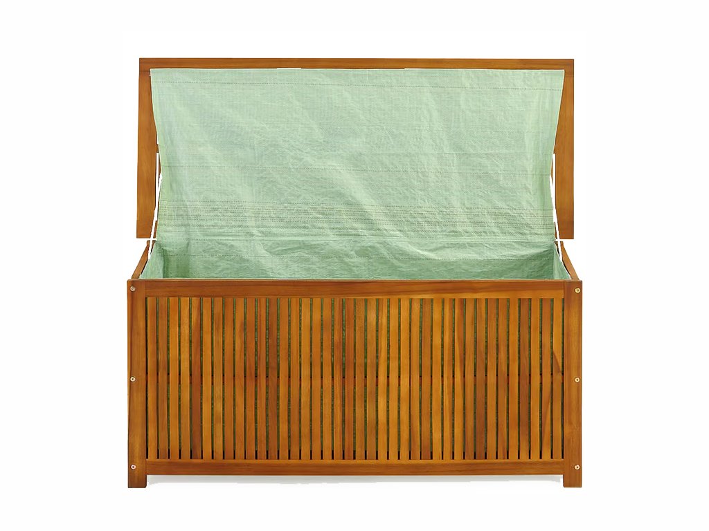 Die Box ist mit einer inneren Schutzplane ausgestattet, die den Inhalt besser vor Regen und Feuchtigkeit schützt. Die offene Lattenkonstruktion sorgt zudem für optimale Luftzirkulation.