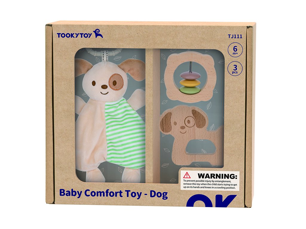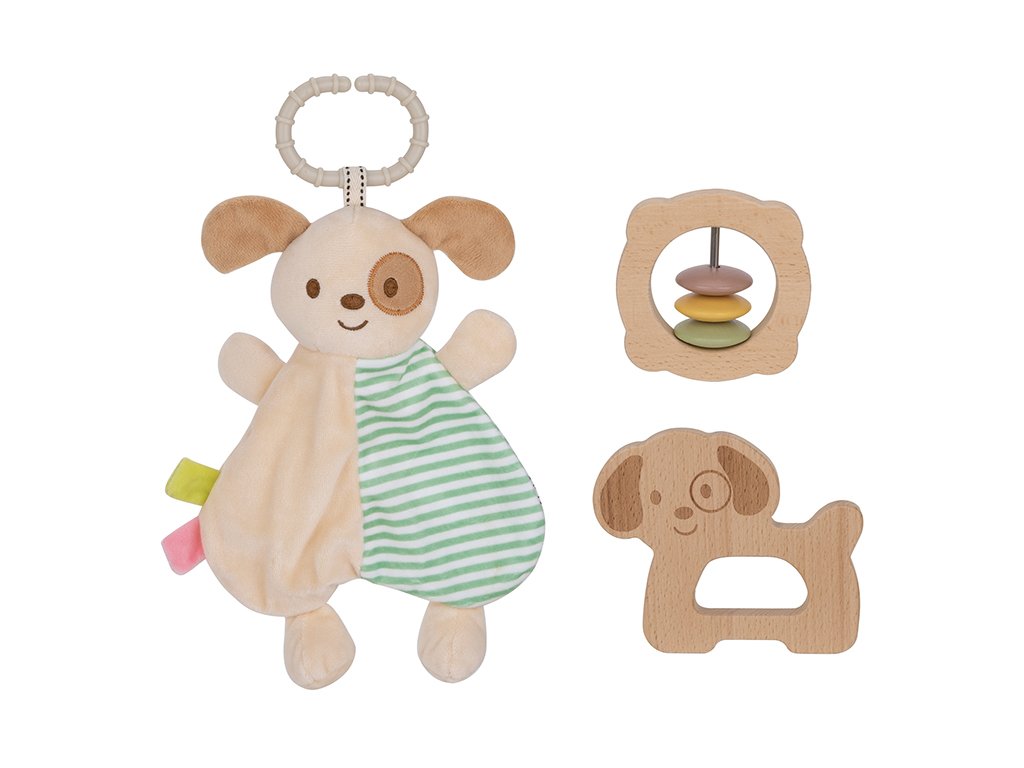 Das Set enthält einen weichen Textilhund, eine Holzrassel mit bunten Ringen und ein Spielzeug in Hundeform. Die einzelnen Produkte sind so gestaltet, dass sie gut in kleine Kinderhände passen, die Feinmotorik fördern und Kindern ein Gefühl von Geborgenheit vermitteln, zum Beispiel wenn die ersten Zähnchen durchbrechen.