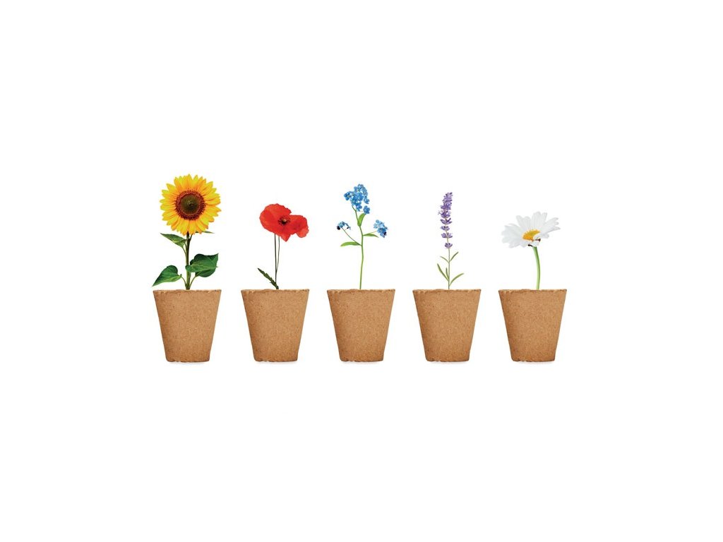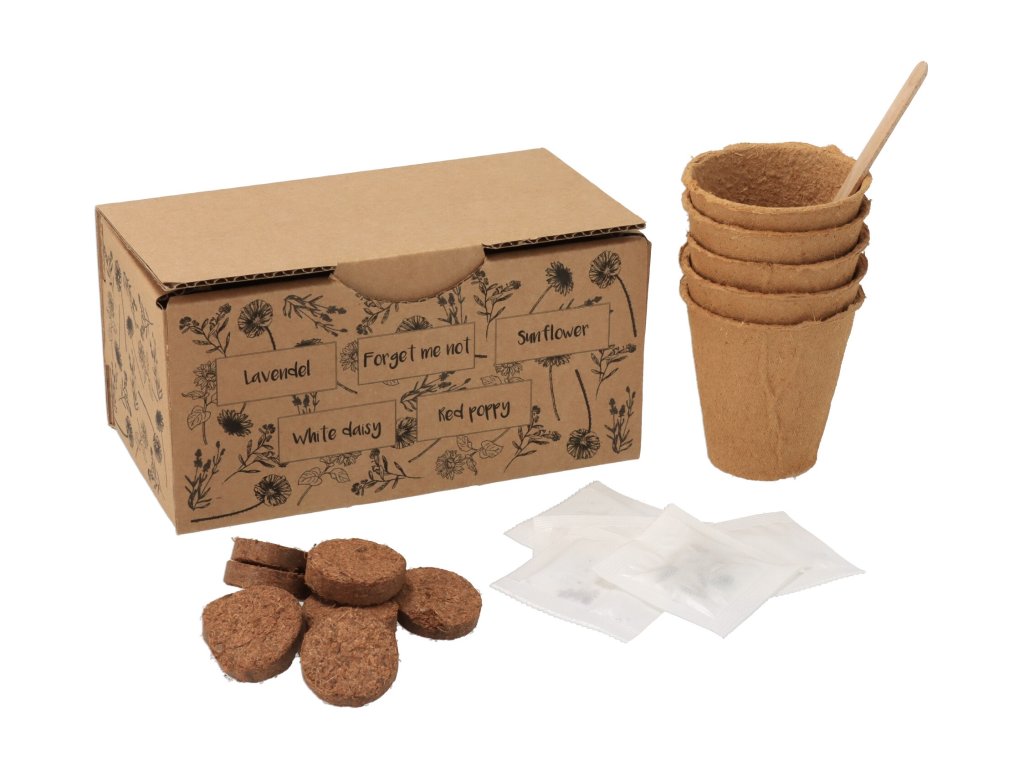 Das Set enthält Samen von Lavendel, Vergissmeinnicht, Sonnenblume, weißem Gänseblümchen und rotem Mohn. Des Weiteren 5 Töpfe aus Kokosfasern, die sich hervorragend für die Blumenzucht eignen, und 5 Stücke getrocknete Erde.