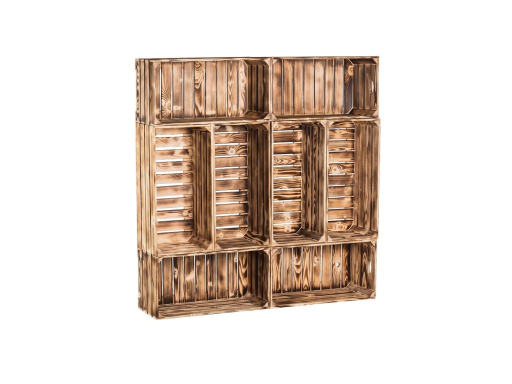 Frisch und natürlich, so wirken Möbel aus geflammten Holzkisten. Obwohl wir die natürliche Farbe des Holzes mögen, wird ihm das Abflammen ein wenig Pep und ein besonderes Aussehen verleihen. Diese Wand aus geflammten Holzkisten hat die Gesamtmaße 120 x 120 x 24 cm.