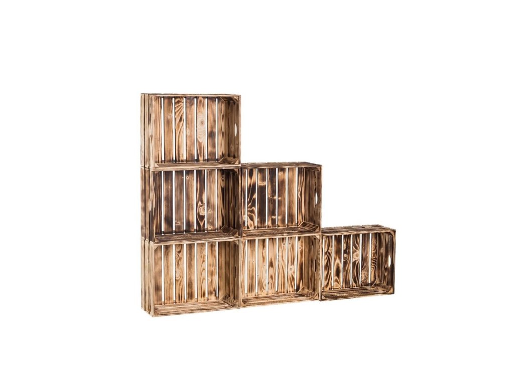 Frisch und natürlich, so wirken Möbel aus geflammten Holzkisten. Obwohl wir die natürliche Farbe des Holzes mögen, wird ihm das Abflammen ein wenig Pep und ein besonderes Aussehen verleihen.