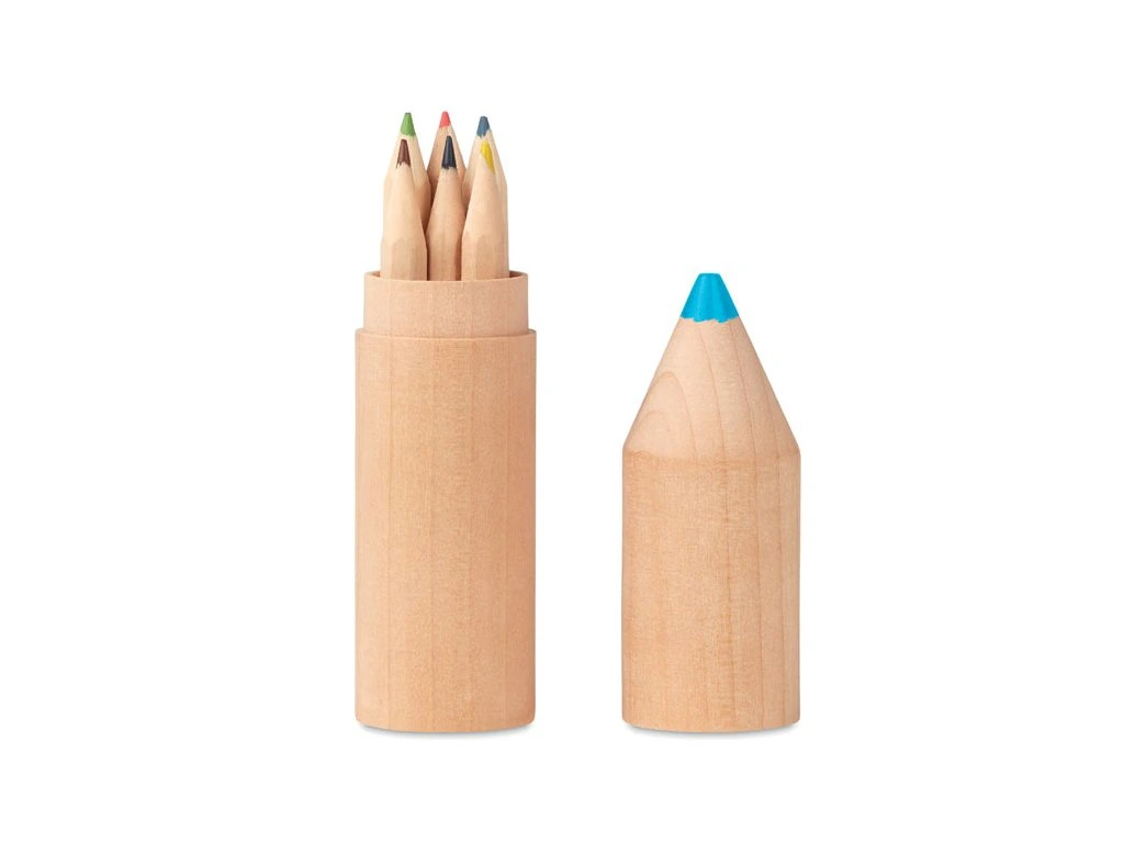 Das Set enthält 6 farbige Buntstifte in einer originalen Holzbox in Form eines Buntstifts.