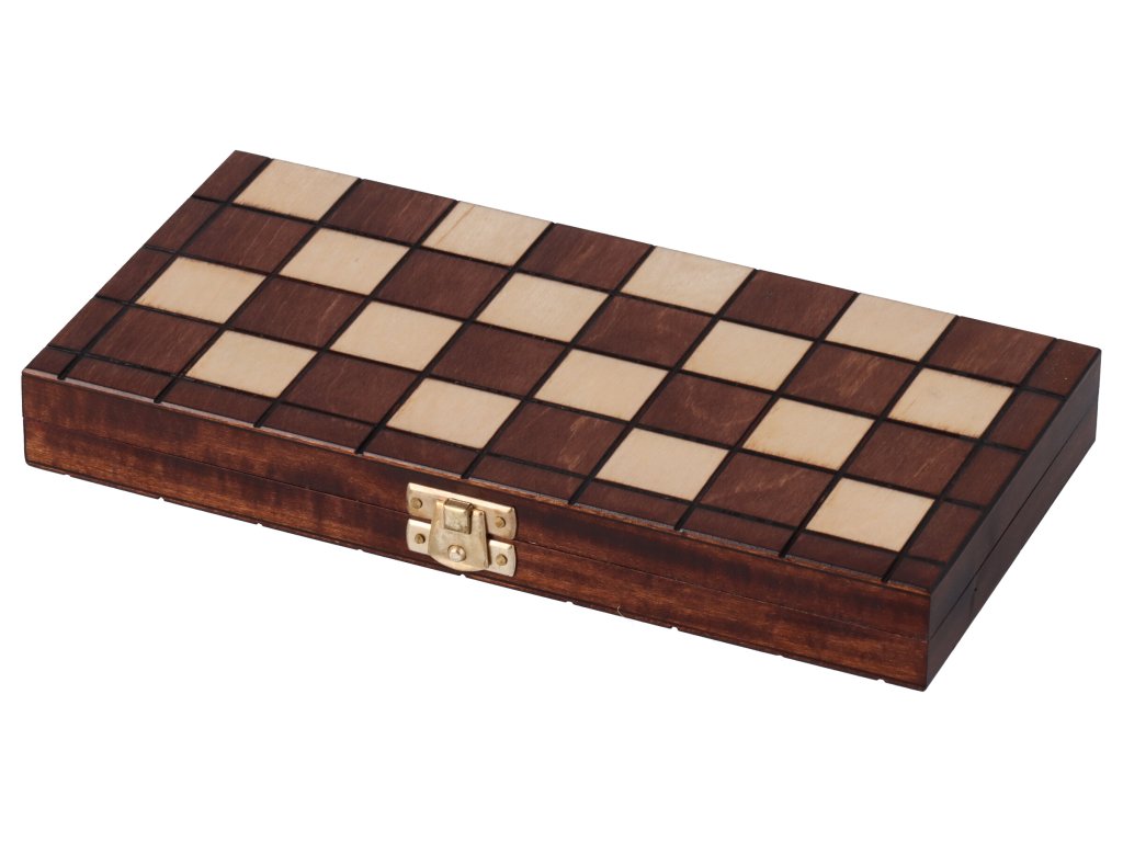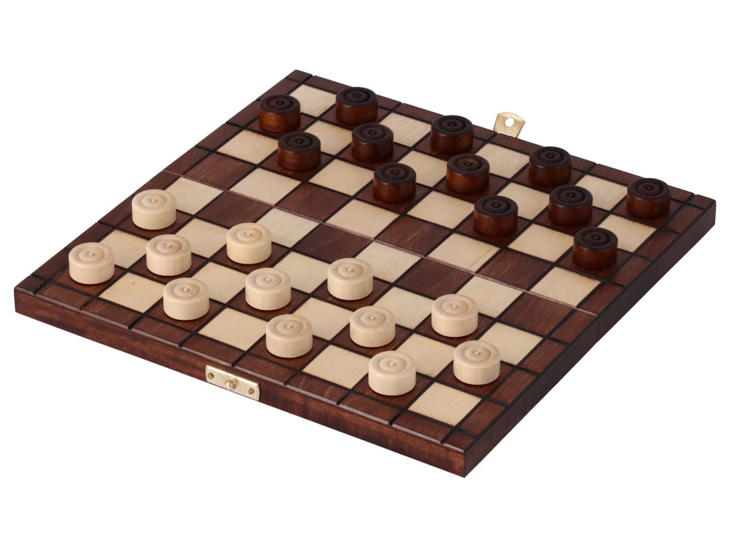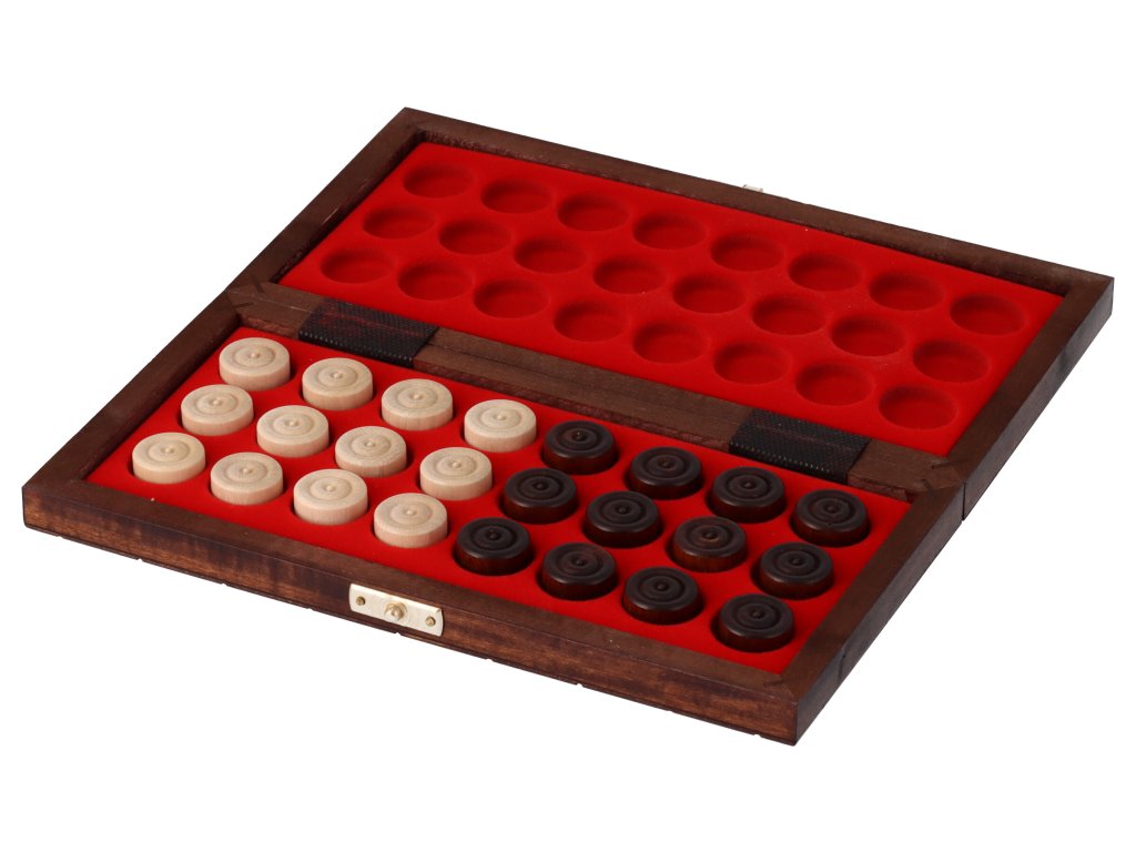 Bis ins Detail ausgearbeitetes Damespiel mit einer Spielfläche von 25 x 25 x 2 cm. Die Figuren mit einem Durchmesser von 20 mm sind in passgenauen Polstern untergebracht.