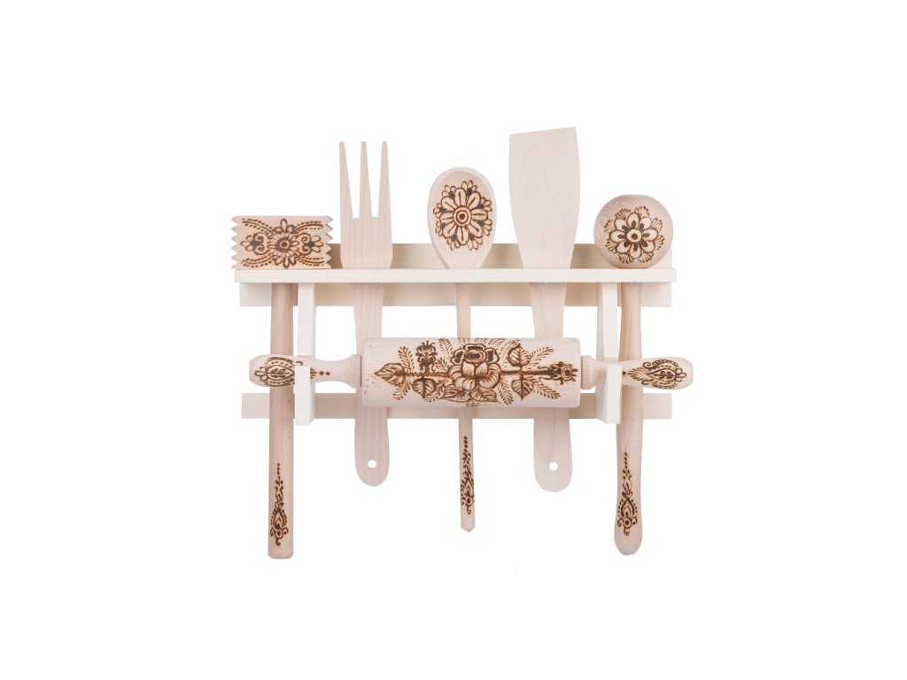 Das Set enthält: Regal, Wallholz, Stößel, Passierkeule, Gabel, Wender und Kochlöffel.