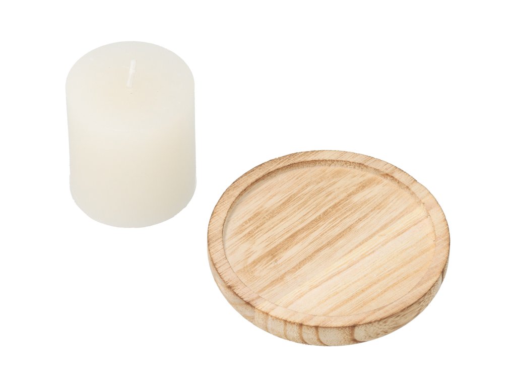 Eine Wachskerze mit dem betörenden Duft von Vanille auf einem natürlichen Holzsockel ist eine schöne Ergänzung für Ihr Interieur und schafft eine warme Atmosphäre.