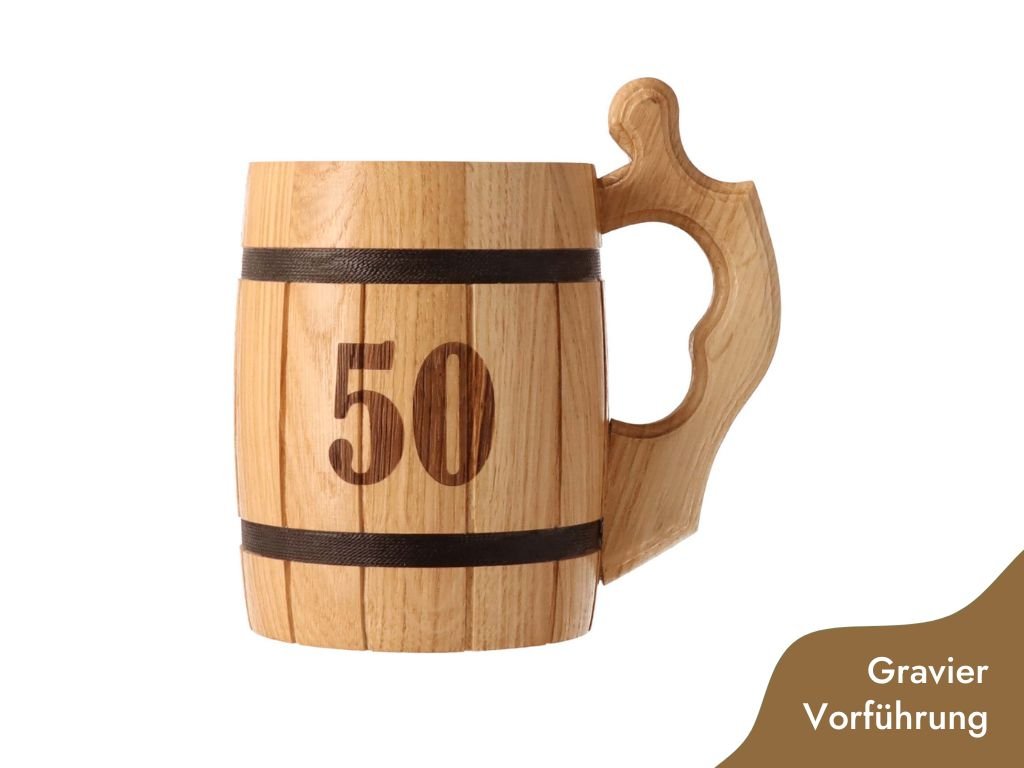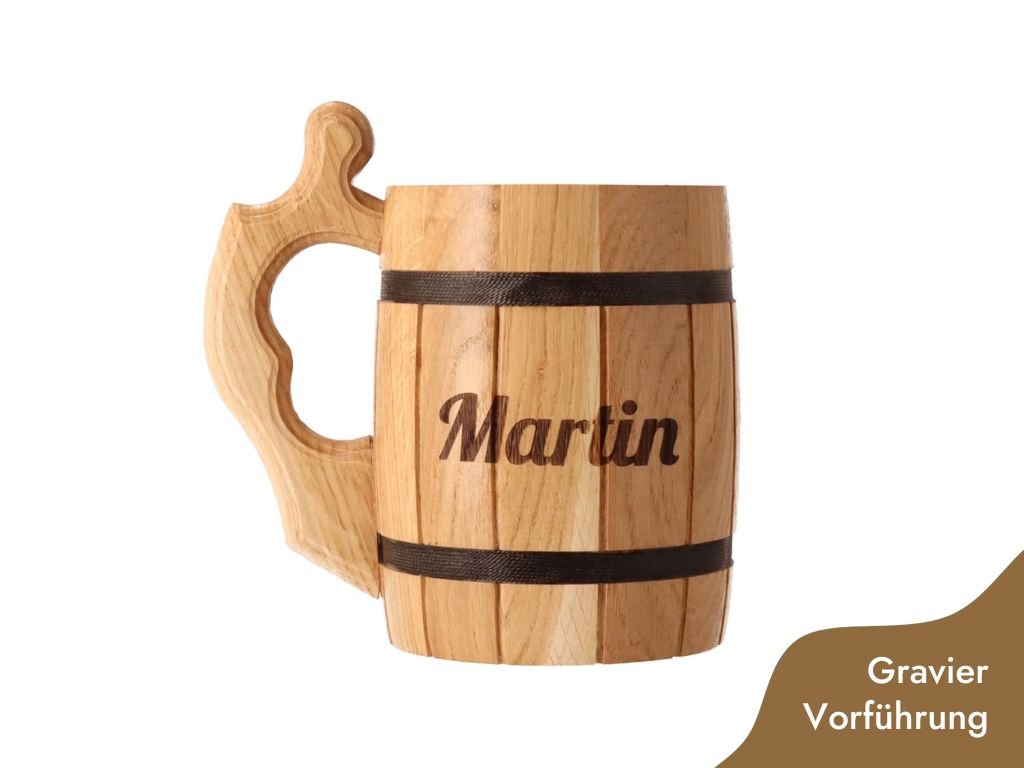 Der Maßkrug ist aus Eichenholz gefertigt, hat ein Volumen von 0,5 l und eine Breite von 17 cm mit Henkel. In Farbe und Schattierung können sie leicht variieren.