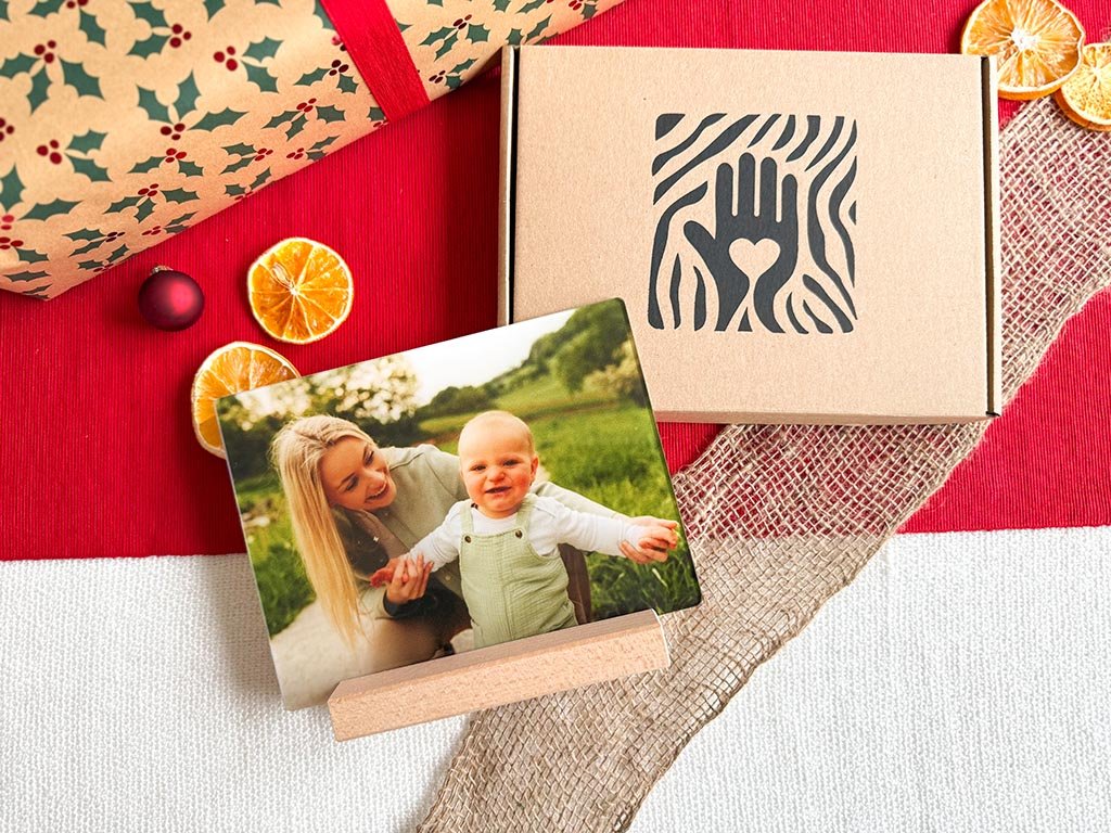Sie erhalten außerdem einen Massivholzständer zum Foto. Vergessen Sie vor der Bestellung nicht zu wählen, ob Sie eine helle oder dunkle Variante des Ständers wünschen.