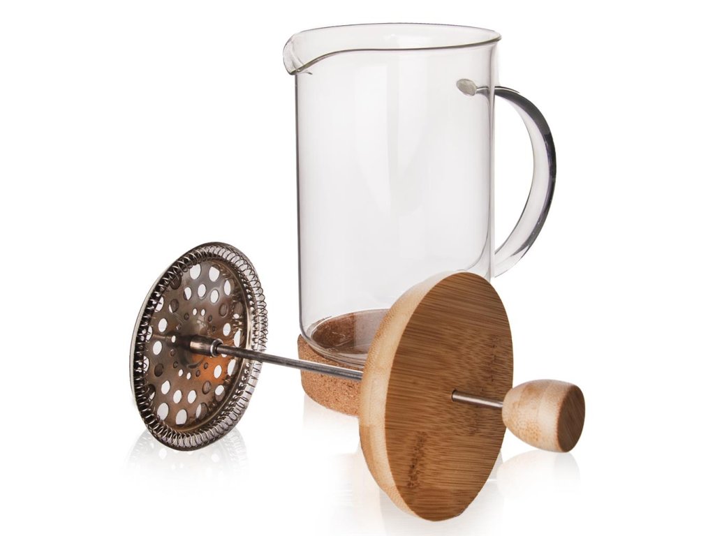 Die 750 ml French Press besteht aus hitzebeständigem Borosilikatglas mit Korkbasis und Bambusdeckel. Der praktische Griff erleichtert das Eingießen des Kaffees.