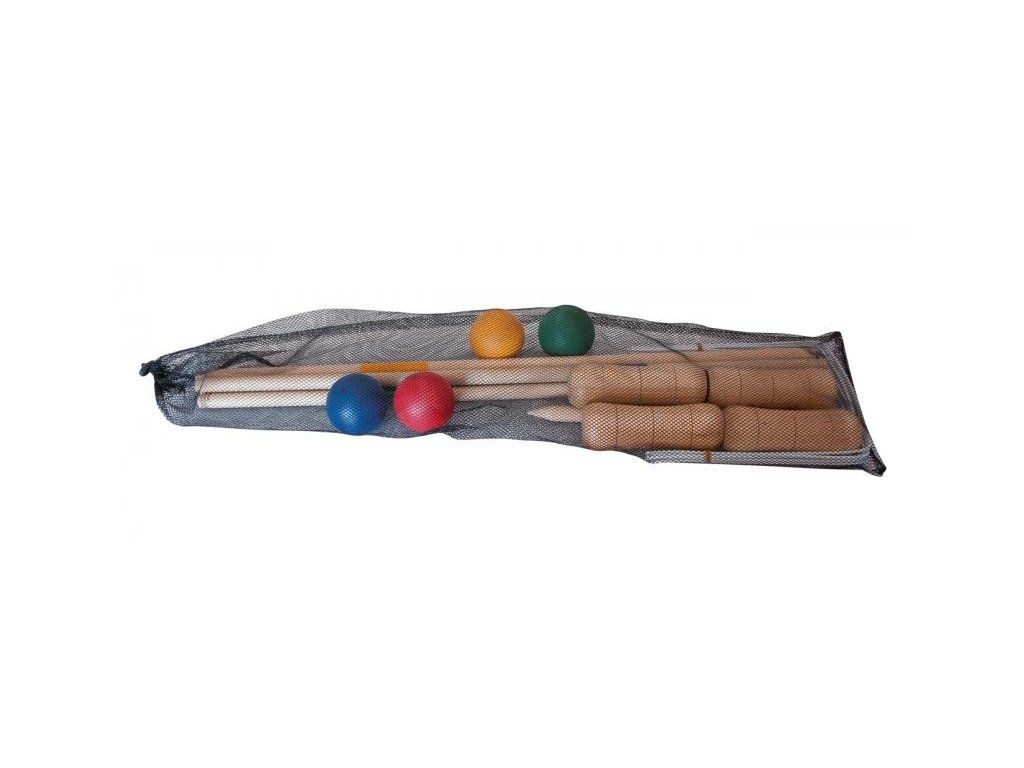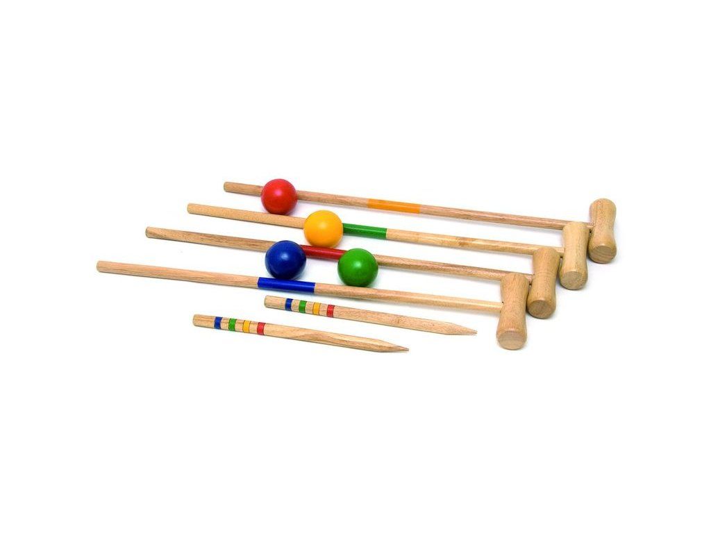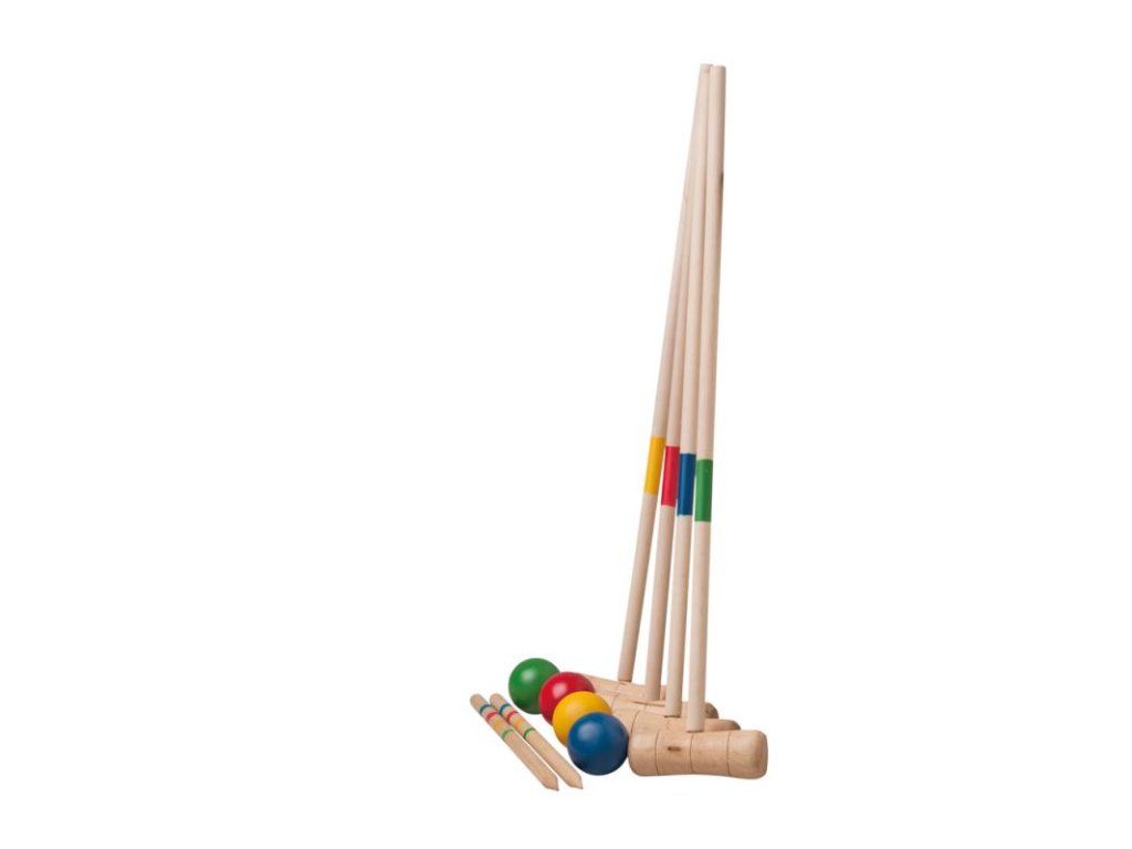 Das Set enthält 24 Teile: 4x zusammenschraubbarer Holzschläger 4x Holzkugel 2x Holzpflock 10x Drahttor