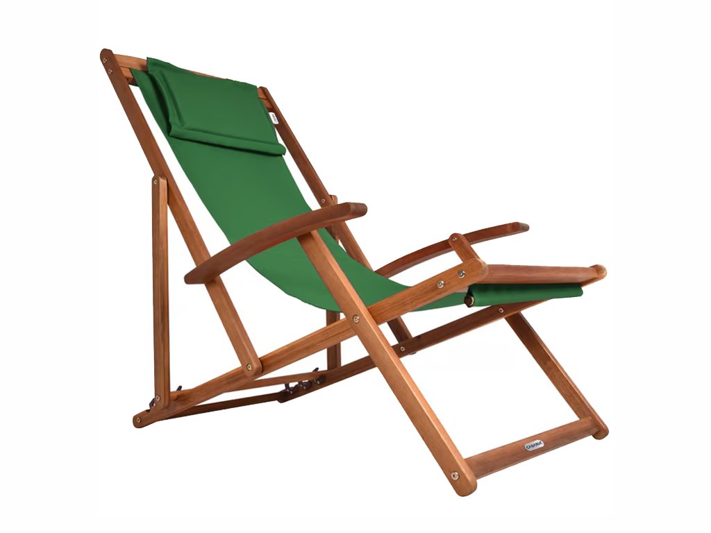 Die Liege ist in drei Positionen verstellbar und lässt sich leicht zusammenklappen, wodurch sie einfach zu transportieren und zu verstauen ist. Armlehnen sowie ein abnehmbares, gepolstertes Kopfkissen mit Klettverschluss sorgen für Komfort. Der atmungsaktive Stoff passt sich dem Körper an und verhindert Schwitzen, selbst bei längerem Sitzen.