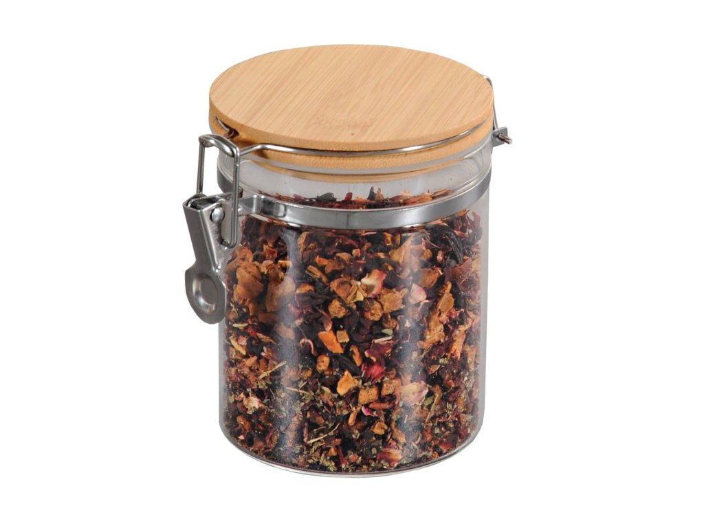 Praktischer 600-ml-Behälter aus hochwertigem Borosilikatglas und Bambusdeckel mit Verschlussclip zur Aufbewahrung von Lebensmitteln wie verschiedenen Süßigkeiten, Trockenobst, Kaffee oder Tee. So bleiben Ihre Schränke oder die Küchentheke aufgeräumt, und Ihre Lebensmittel bleiben länger frisch.