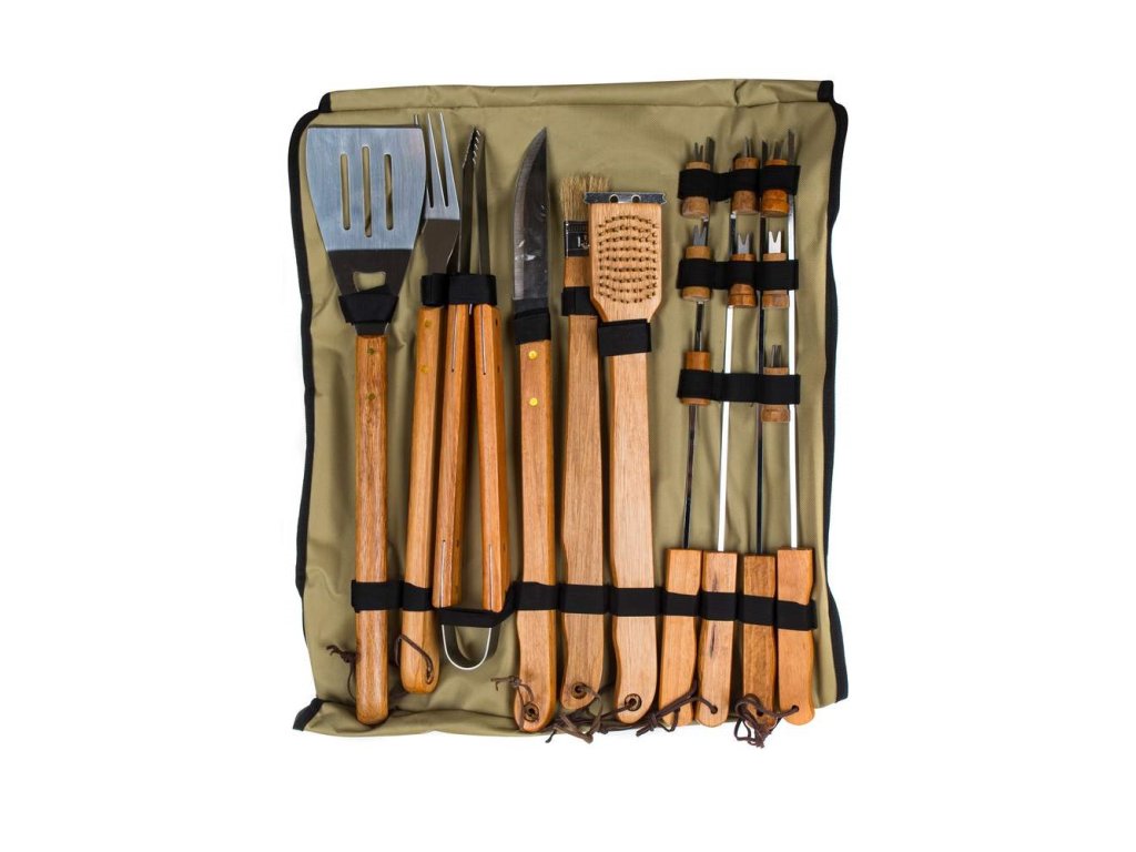 Das praktische 18-teilige hölzerne Grill-Set wird in der Sommersaison sehr nützlich sein, und dank der Tasche, in der die Werkzeuge verpackt sind, können Sie das Set auch bedenkenlos mit in den Urlaub nehmen. Die Grillwerkzeuge sind mit Schlaufen zum Aufhängen versehen.