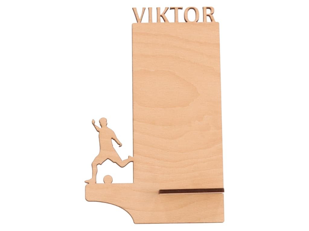 Bewahren Sie Ihr Handy stilvoll auf. Der Holzständer mit individuellem Sportmotiv und Namen eignet sich für zu Hause und das Büro. Freude macht er auch als Geschenk.
