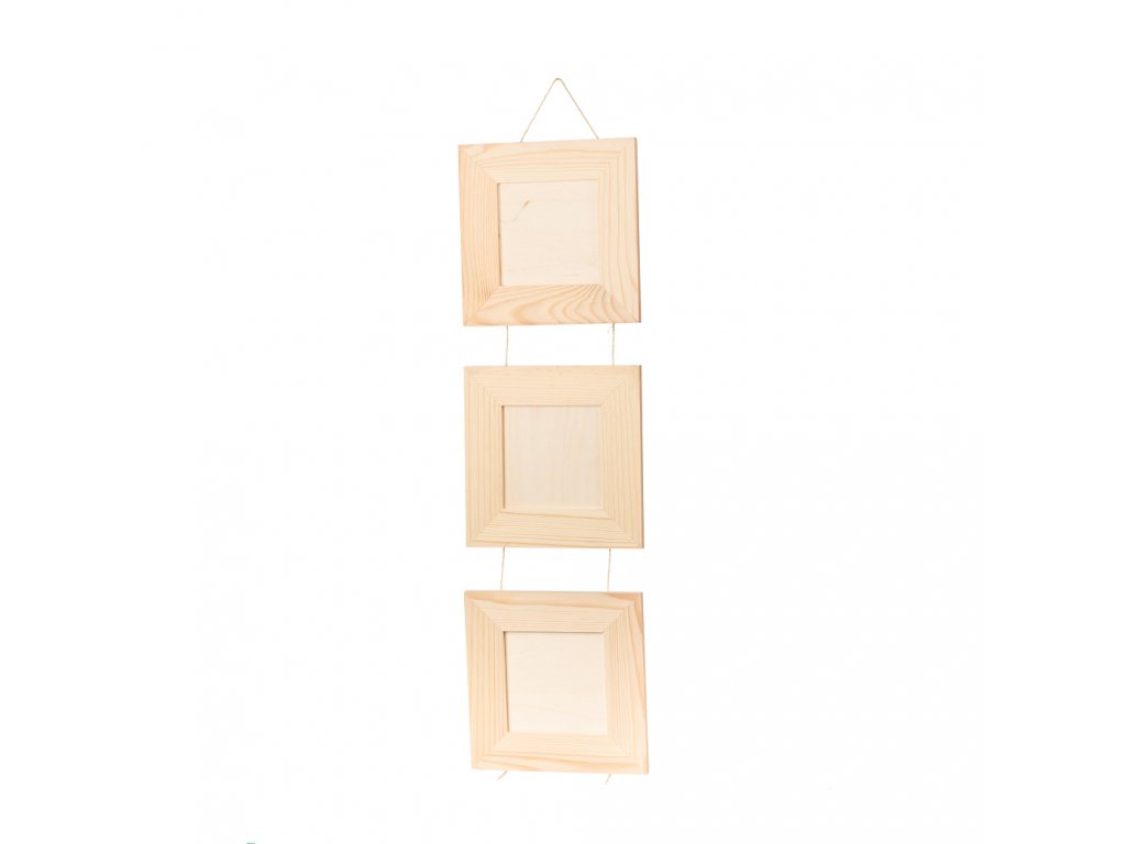 Set aus drei hölzernen Fotorahmen aus Kiefernholz an einer Schnur, geeignet zum Aufhängen.