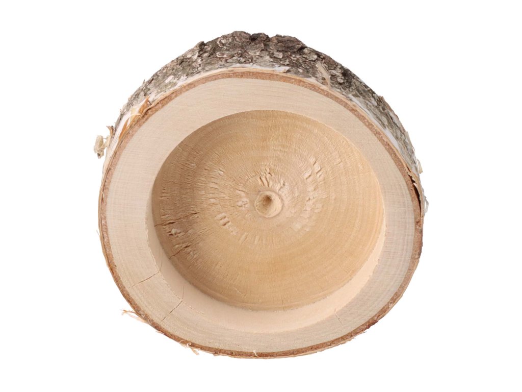 Der Kerzenständer ist aus natürlichem Birkenholz mit Rinde gefertigt und jedes Stück ist ein Original, das im endgültigen Aussehen und in der Größe variieren kann. Der Durchmesser des Kerzenständers beträgt zwischen 10 und 13 cm.
