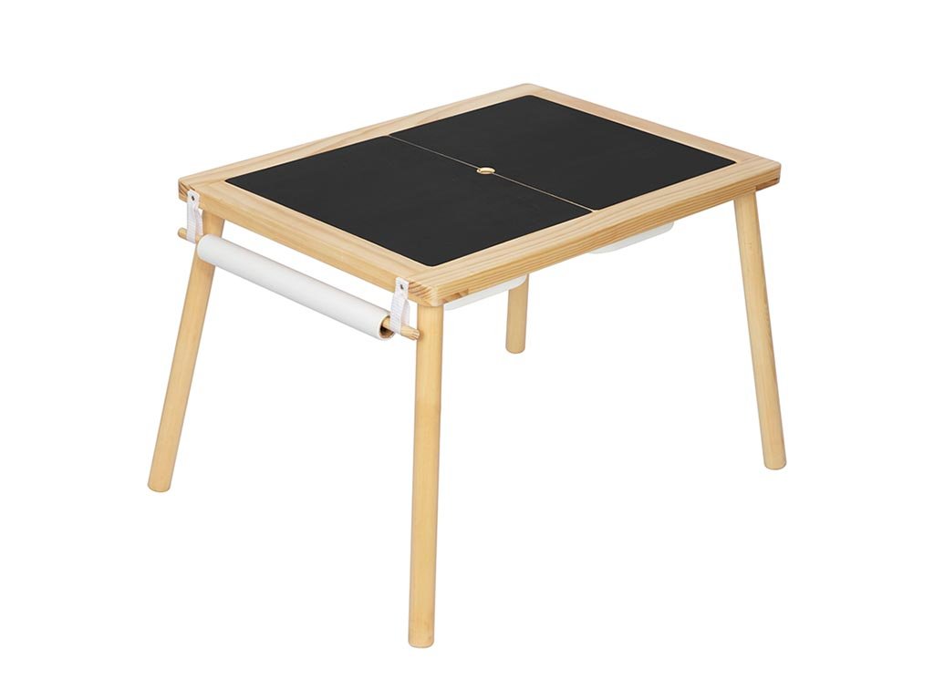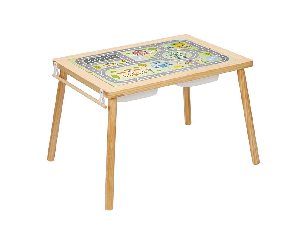 Kinder können auf dem Spielbrett Wege malen, bauen, mit Autos spielen oder in den unter der klappbaren Tischplatte versteckten Sensorikschalen neue Reize entdecken. Der Tisch bietet Raum für die Entwicklung von Fantasie, Feinmotorik und Kreativität.