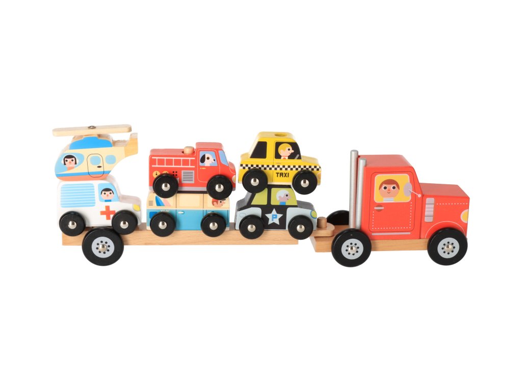 Ein Holzspielzeug, das nicht nur ein Anhänger mit Autos ist, sondern auch ein Steckspiel, das die Motorik und Geschicklichkeit der Kinder schult. Die Kinder können die Autos abnehmen, mit ihnen spielen und sie dann wieder auf den Anhänger setzen, um damit durch das ganze Haus zu fahren.