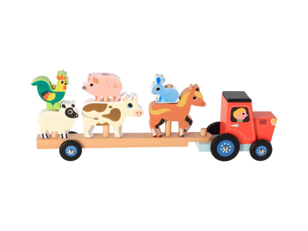 Ein Holzspielzeug, das nicht nur einfach ein Traktor mit einem Anhänger für Tiere ist, sondern auch ein Steckspiel, das die motorischen Fähigkeiten und die Geschicklichkeit der Kinder trainiert. Die Kinder können die Tiere abnehmen, mit ihnen spielen und sie dann wieder auf den Anhänger setzen, mit dem sie an einen anderen Ort fahren.
