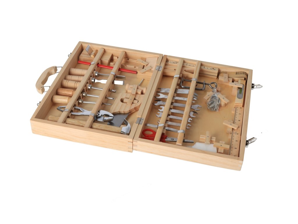 Ein Set mit 48 Werkzeugen aus Holz und Metall in einer tollen, maßgefertigten Box bietet kleinen Heimwerkern endlose Stunden aktiven Spaß.