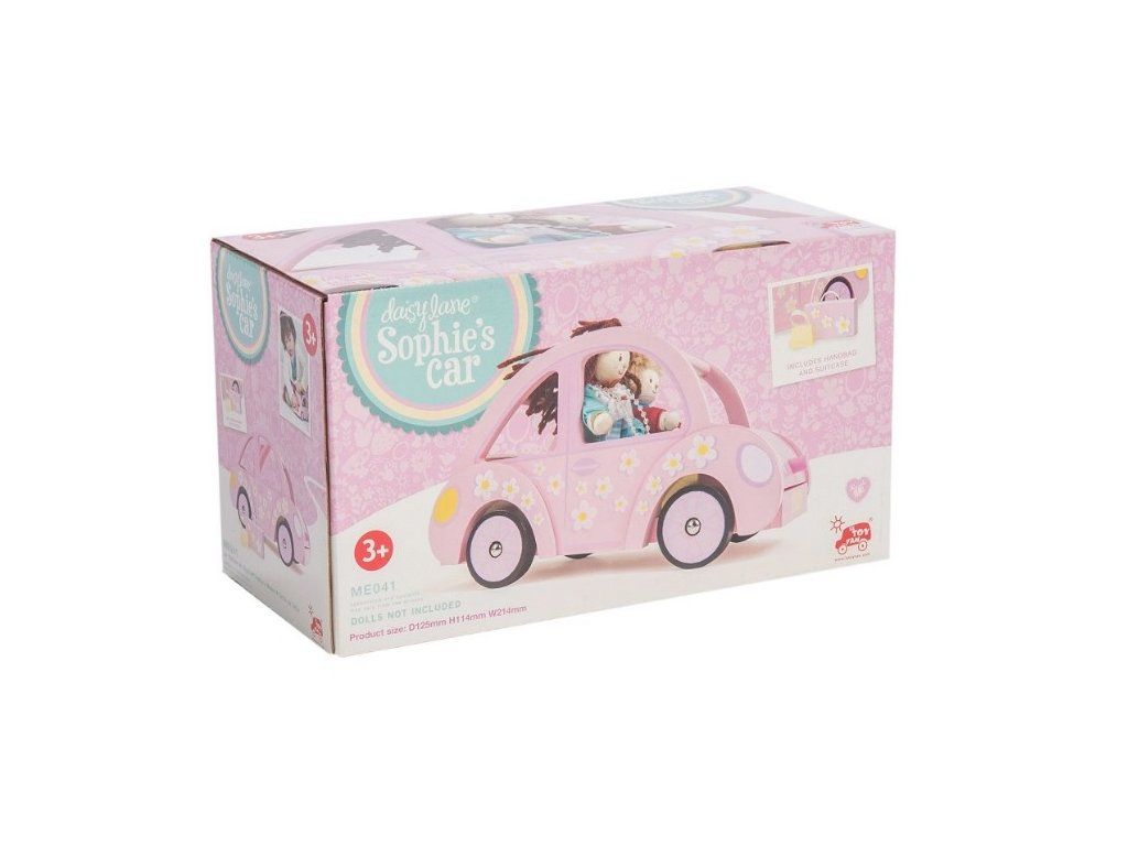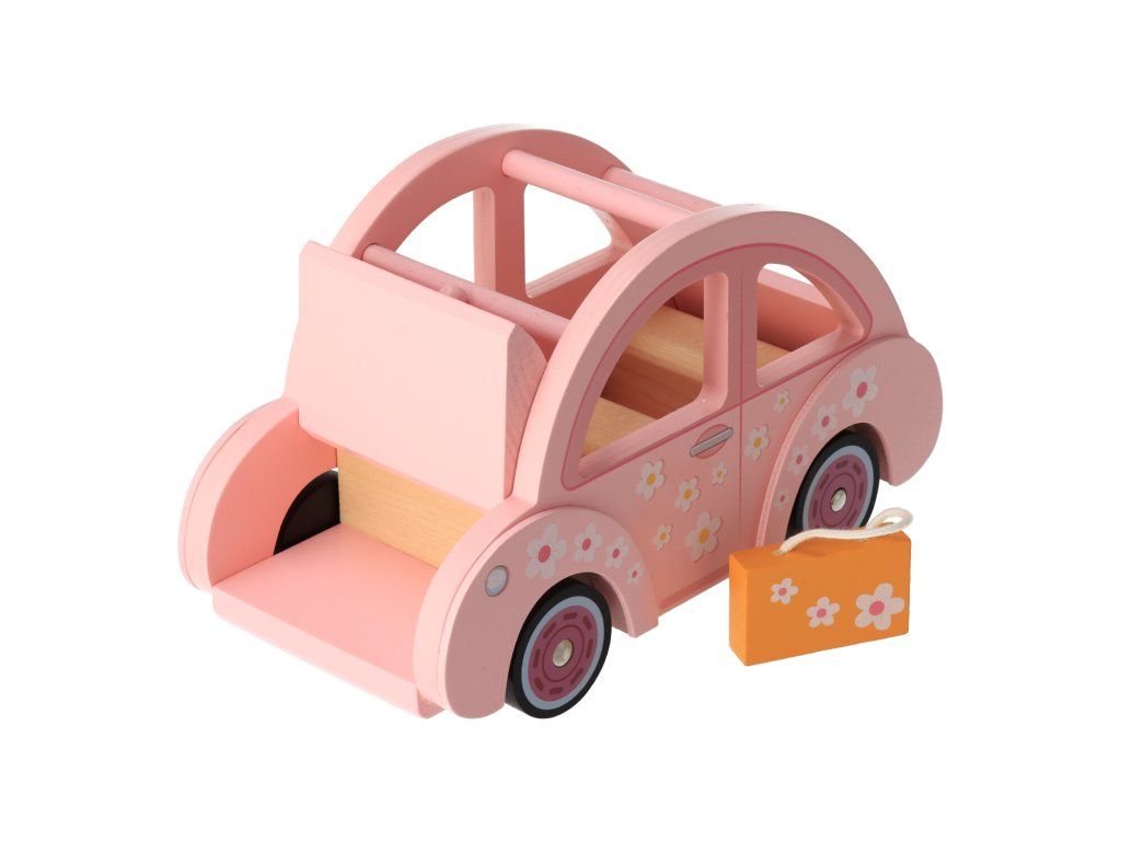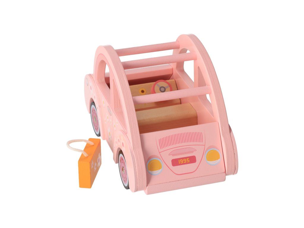 Das Auto besteht aus lackiertem Holz in rosa Farbe und hat Gummiräder. Es eignet sich sowohl zum Spielen als auch zur Dekoration von Kinderzimmern. Das Gepäck ist im Lieferumfang enthalten.