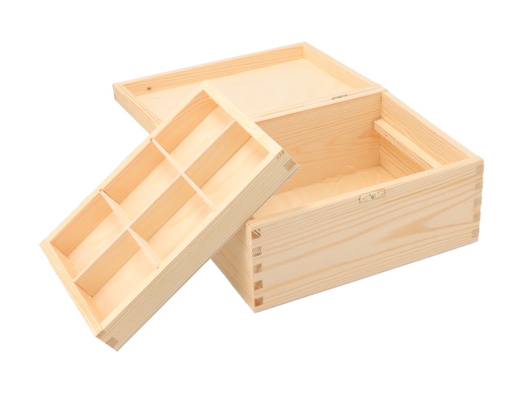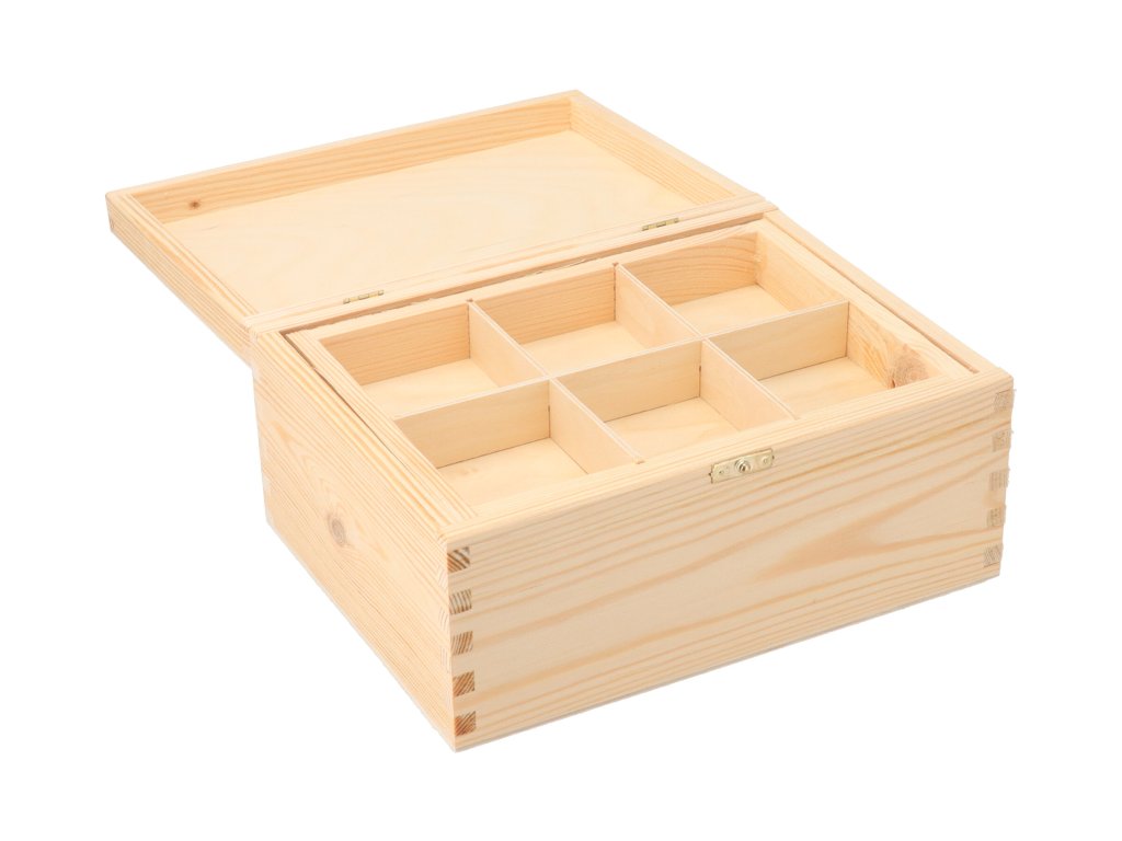 Diese schöne Box aus Kiefernholz hat einen praktischen Deckel und 6 Fächer, in denen Sie Ihre Schätze aufbewahren können.