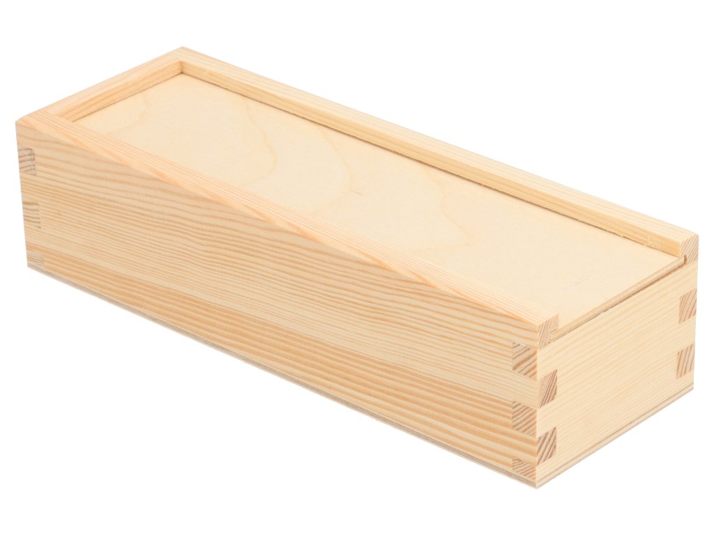 Sie ist aus Kiefernholz und Sperrholz gefertigt. Die Innenmaße betragen 21 x 6 x 4,5 cm.