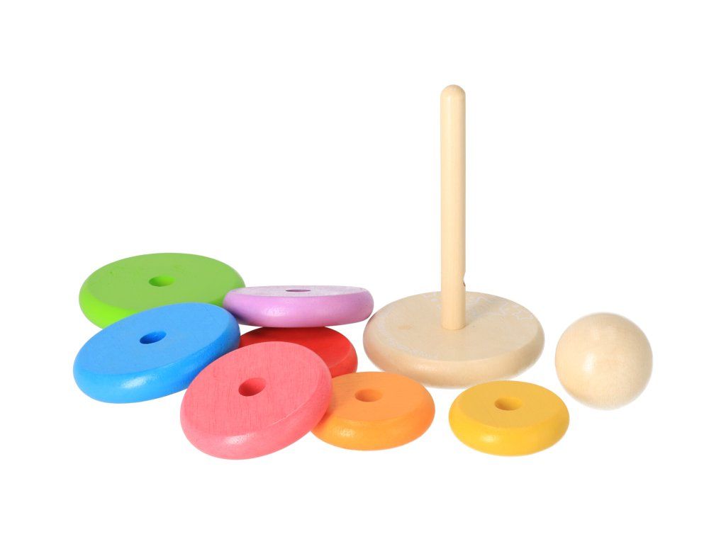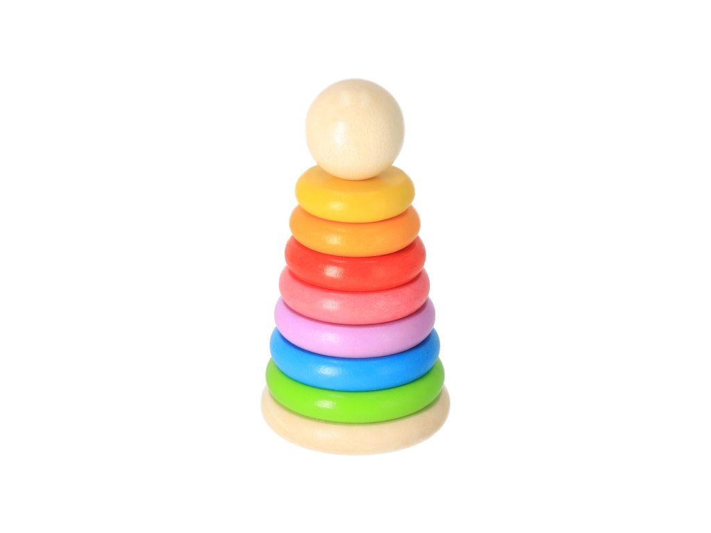 Ein beliebtes Holzspielzeug, das zur Entwicklung der motorischen Fähigkeiten beiträgt, Geduld lehrt. Und dank des schönen regenbogenfarbenen Männchens können die Kinder die Farberkennung üben.