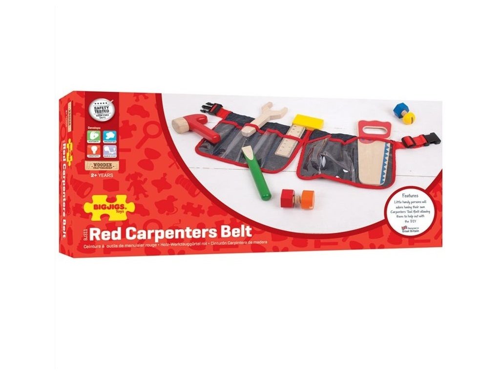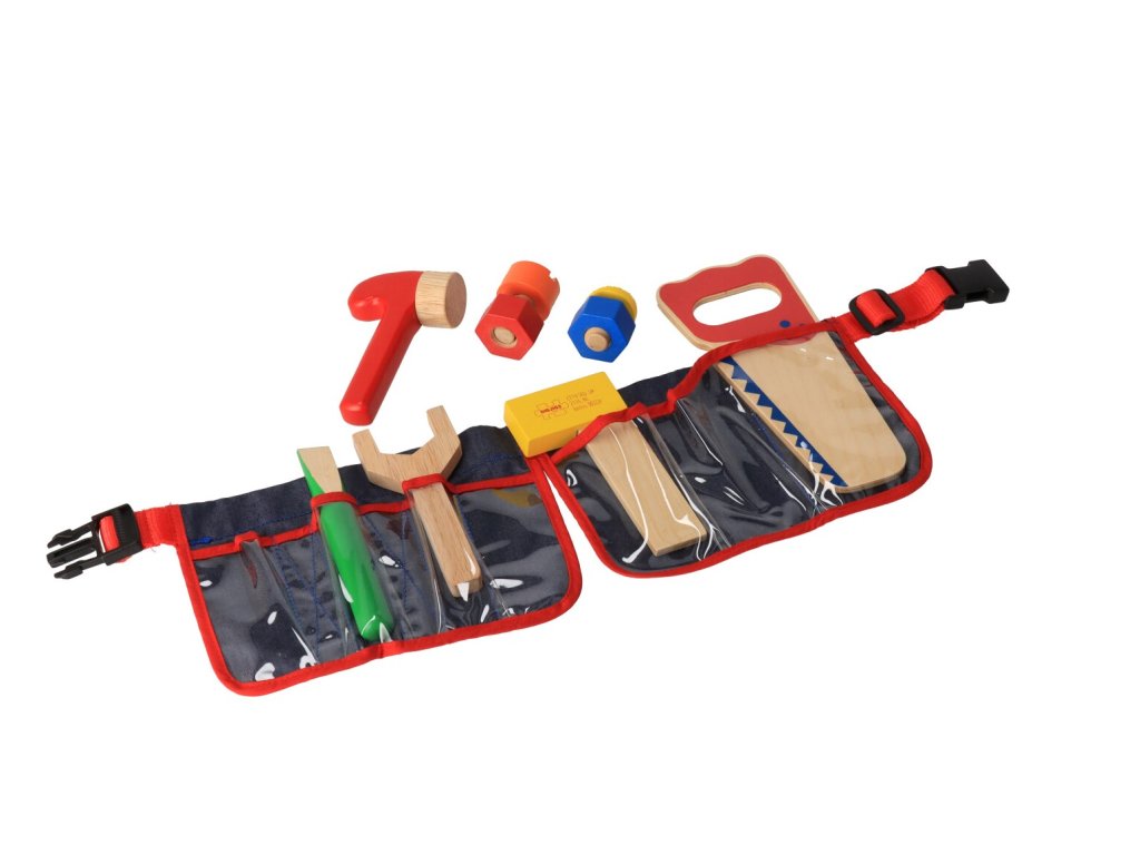 Das hölzerne Werkzeugset mit Gürtel enthält alles, was ein kleiner Handwerker für seine Arbeit braucht. Das Spielzeug fördert die Geschicklichkeit, die Motorik und die Hand-Augen-Koordination der Kinder.