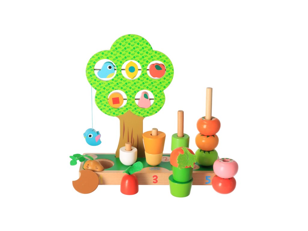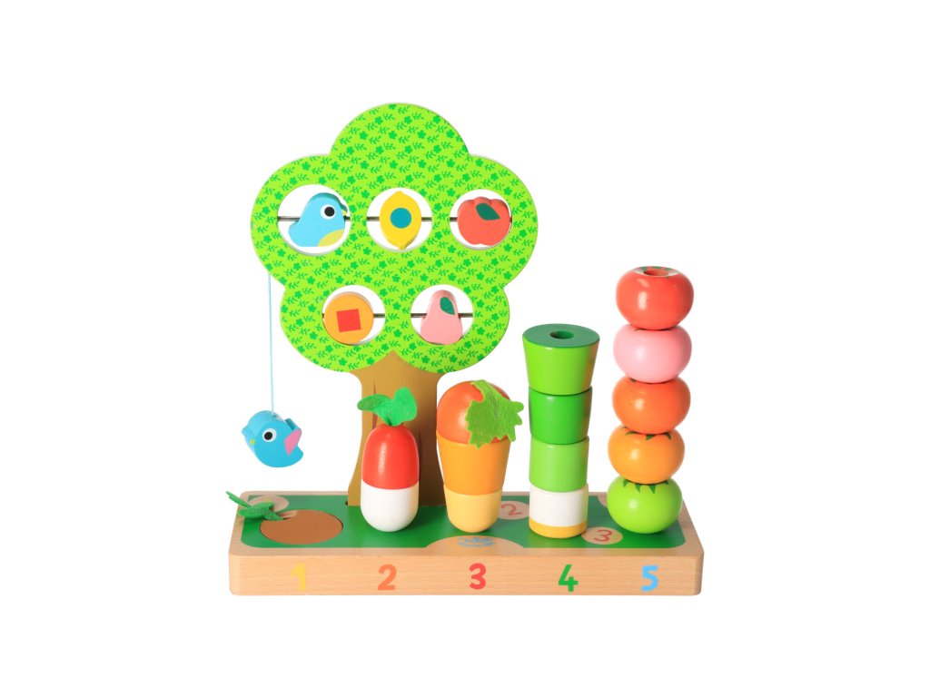 Dieses Holzspielzeug besteht aus einem Grundbrett, Gemüse und einem Baum mit drehbaren Teilen. Zu den Gemüsesorten gehören zum Beispiel Karotten, Lauch und Tomaten. Die Kinder fädeln das Gemüse und seine Teile auf Holzstäbchen auf.