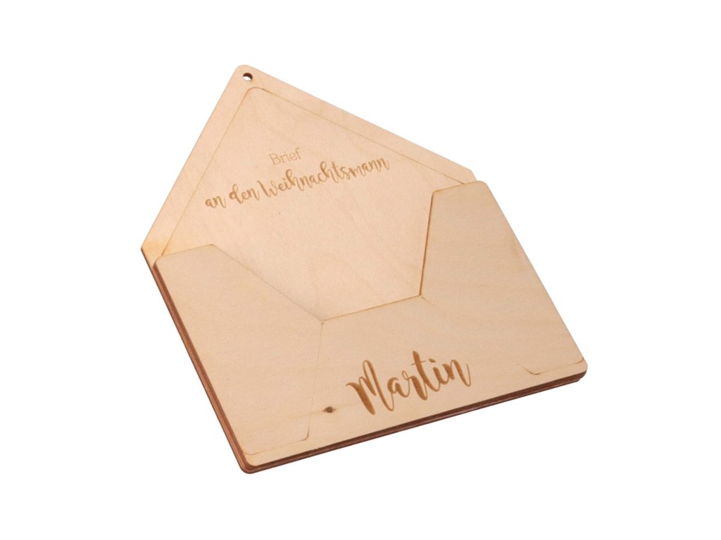 Hölzerner Umschlag für einen Brief an den Weihnachtsmann mit Namen