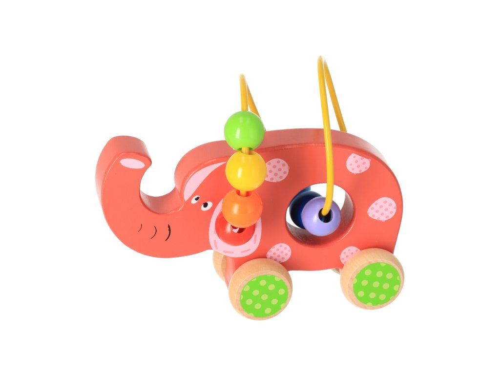 Hölzerner bemalter Elefant aus Qualitätsholz auf vier Rädern mit motorischem Drahtlabyrinth.