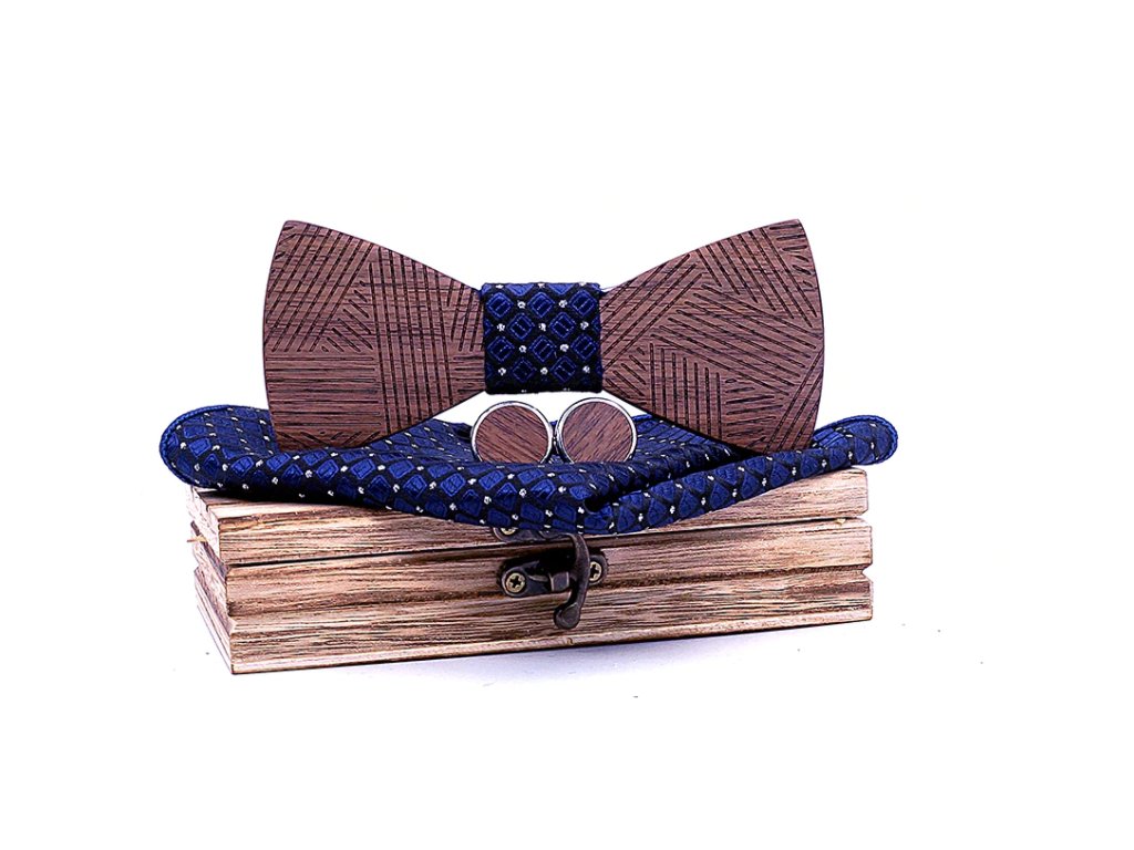 Die Holzfliege aus rohem Holz mit frischem Design findet in jeder Herrengarderobe einen Platz. Das Paket enthält eine Geschenkbox aus Holz und ein Einstecktuch mit demselben Muster.