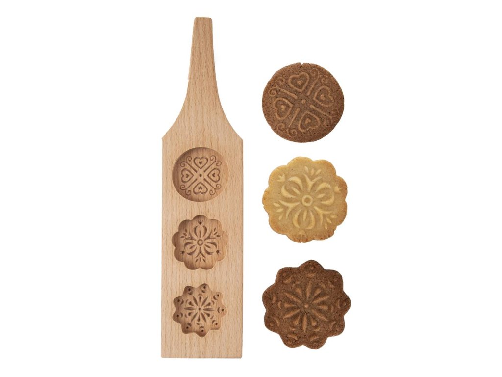 Die Form ist aus natürlichem Buchenholz gefertigt und enthält drei runde Formen mit schönen Verzierungen. Sie können damit geprägte Lebkuchen, Plätzchen oder Kekse herstellen.