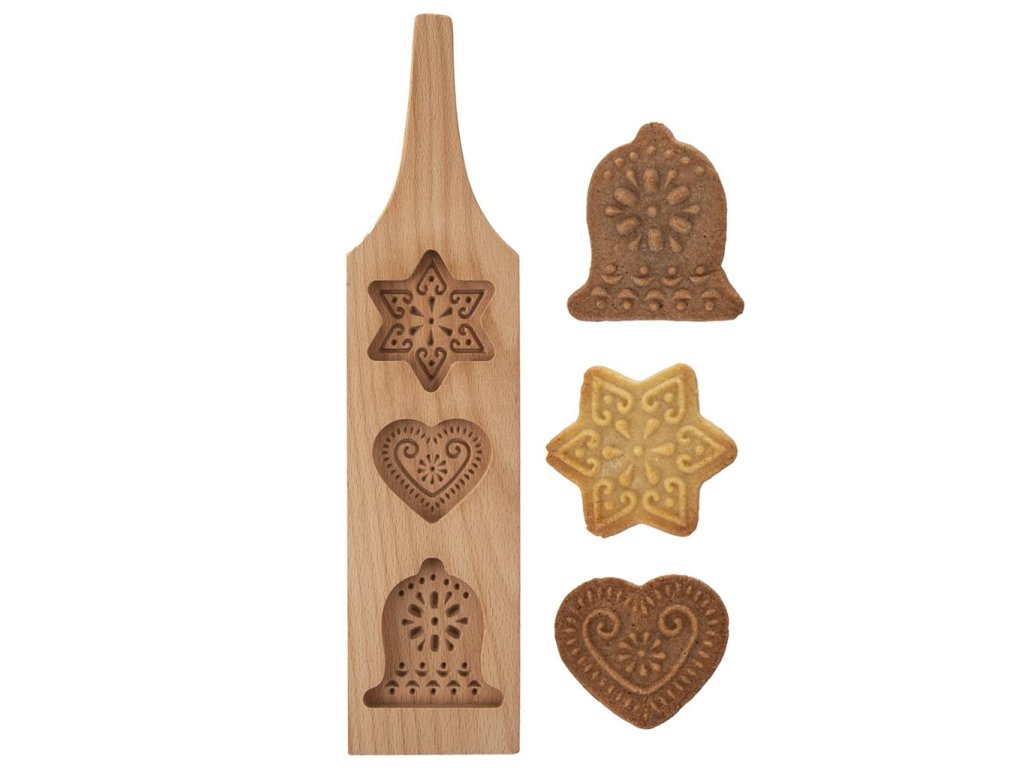 Holzform zur Herstellung von verzierten Lebkuchen und Keksen in Form eines Sterns, eines Herzens und einer Glocke. Und wenn man gerade nicht damit backt, ist sie eine schöne Dekoration.