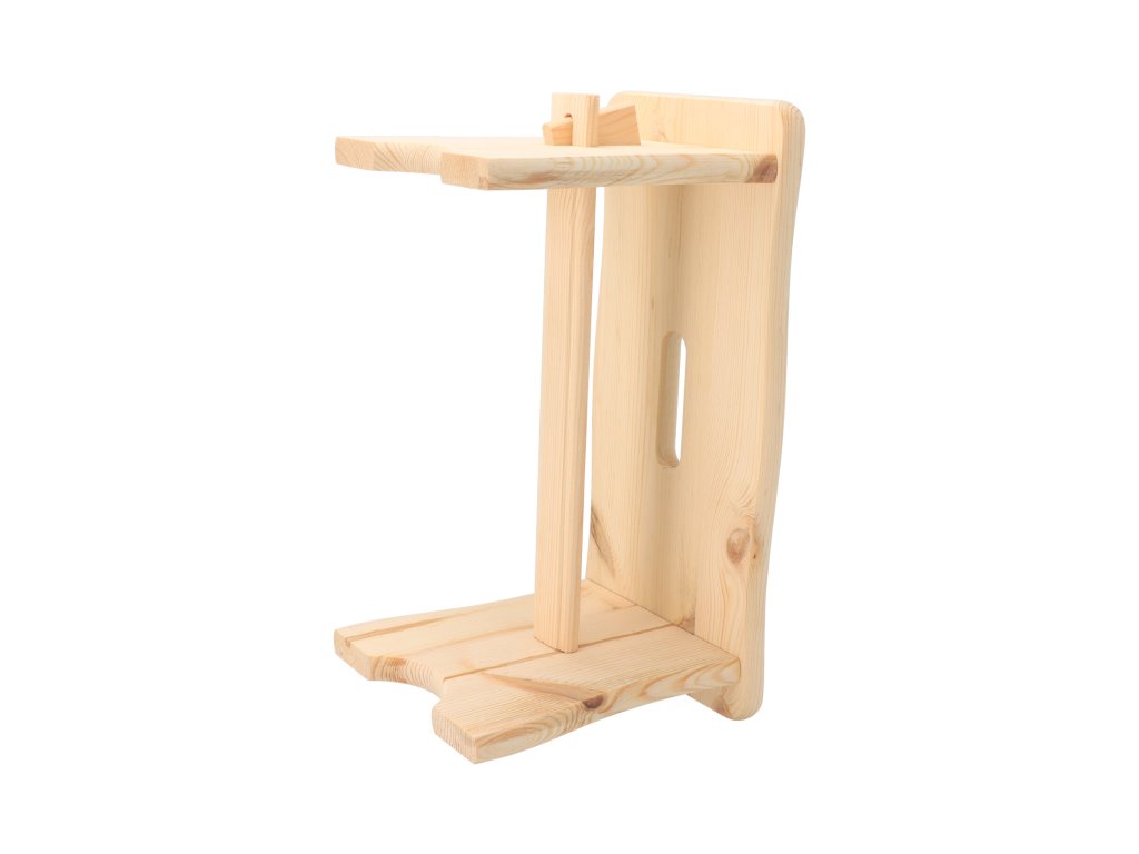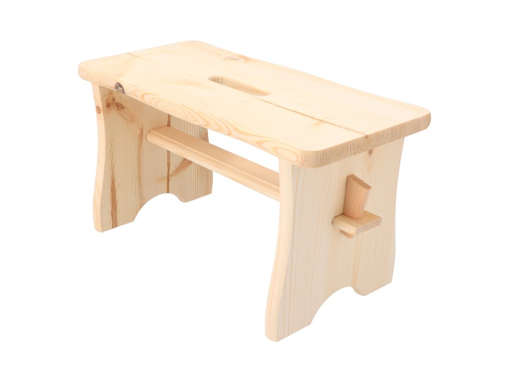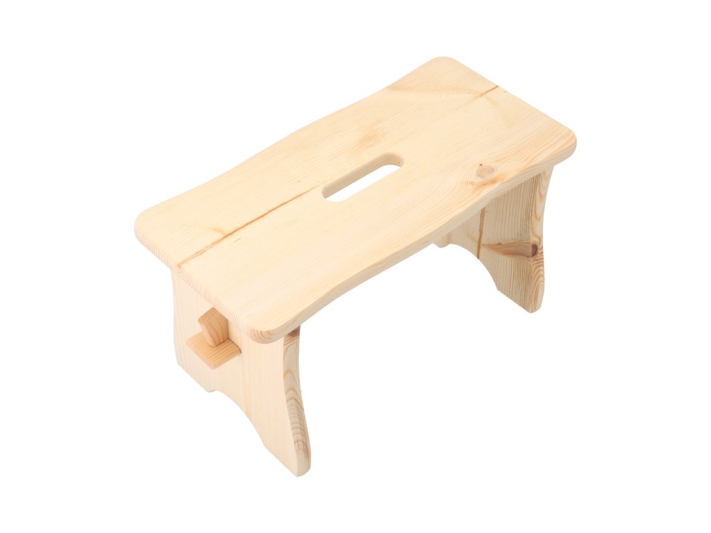 Der Hocker ist aus Kiefernholz gefertigt, riecht gut und lässt sich dank seiner kompakten Abmessungen und des praktischen Griffs leicht dorthin bewegen, wo er gebraucht wird.