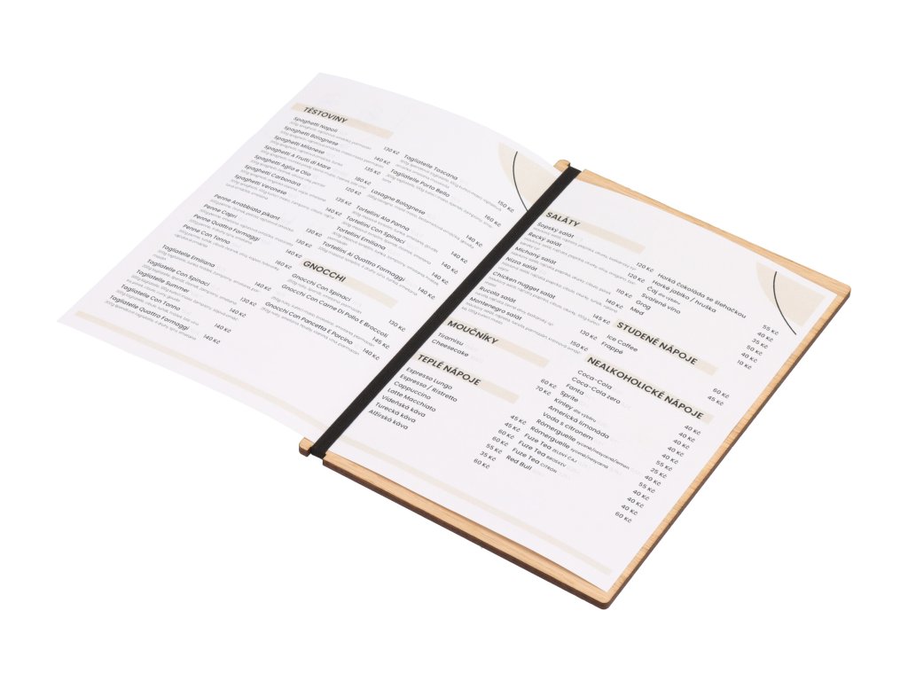 Drucken Sie einfach die Speisekarte aus und stecken Sie sie unter dem festen Gummi ein. Wenn sie verschmutzt oder beschädigt wird, können Sie sie sofort durch eine neue ersetzen, so dass jeder Kunde eine elegante Speisekarte erhält.