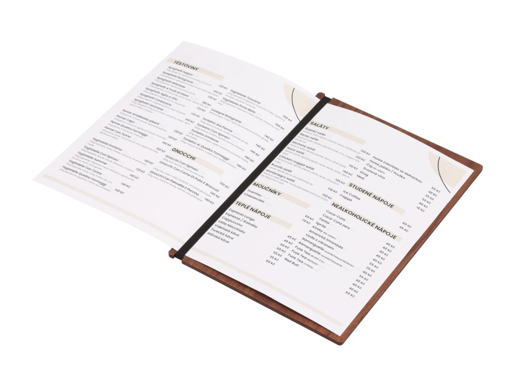 Drucken Sie einfach die Speisekarte aus und stecken Sie sie unter dem festen Gummi ein. Wenn sie verschmutzt oder beschädigt wird, können Sie sie sofort durch eine neue ersetzen, so dass jeder Kunde eine elegante Speisekarte erhält.