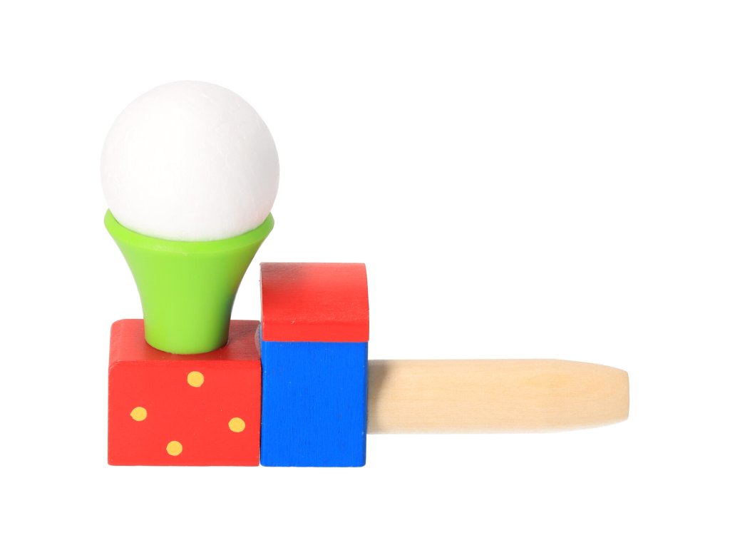 Holzspielzeug zum Pusten in Form einer Lokomotive. Die Aufgabe des Kindes ist es, den Ball durch Pusten so lange wie möglich in der Luft zu halten. Das Spielzeug ist ein ideales Hilfsmittel für Atemübungen.