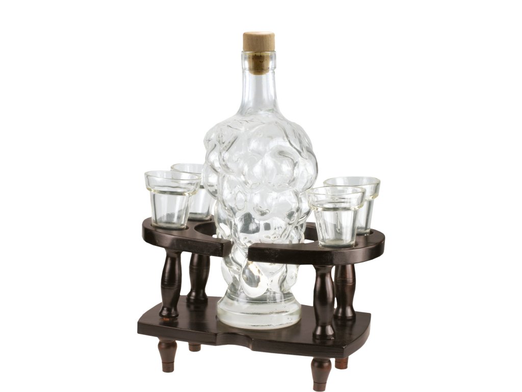 Luxuriöses Set aus Dekanter mit Deckel und vier Gläsern für Spirituosen und Liköre. Das Set wird in einem eleganten Holzständer geliefert.