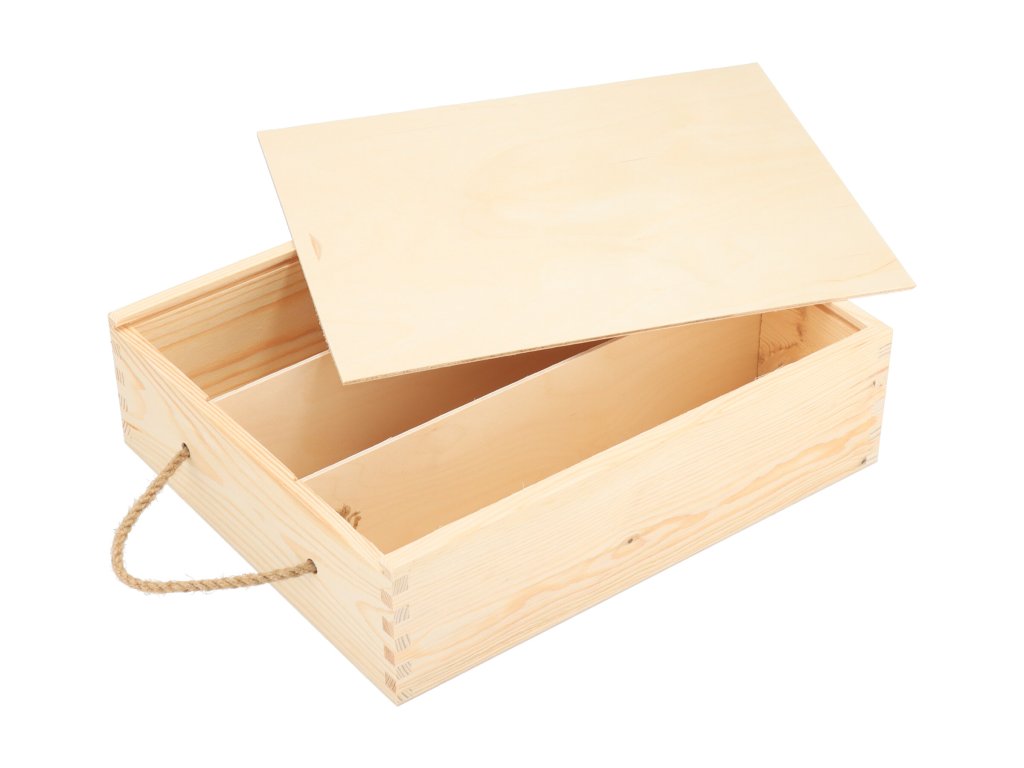 Die Innenmaße der Weintruhe betragen 34 x 28 x 9,5 cm und die der Fächer 34 x 9 x 9,5 cm.