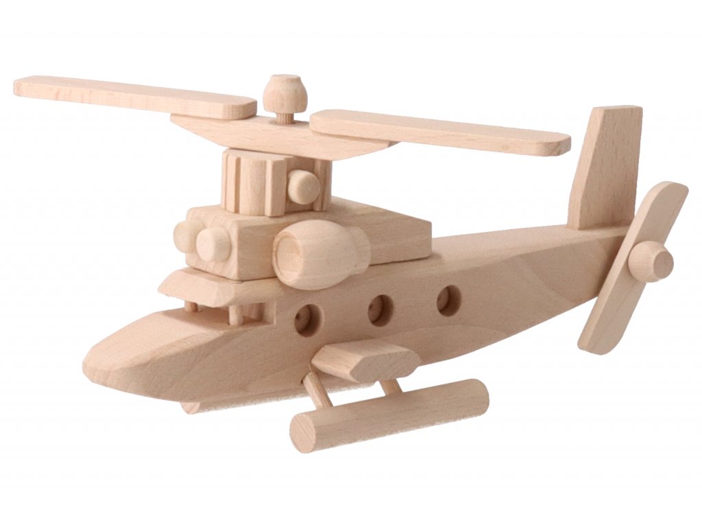 Der Modellhubschrauber aus Holz ist ein beliebtes Spielzeug für Jungs in jedem Alter. Die Oberfläche ist völlig natürlich, der Propeller dreht sich und mit Hilfe von Farben können Sie ein Spielzeug oder eine originelle Dekoration nach Ihrem Geschmack gestalten.