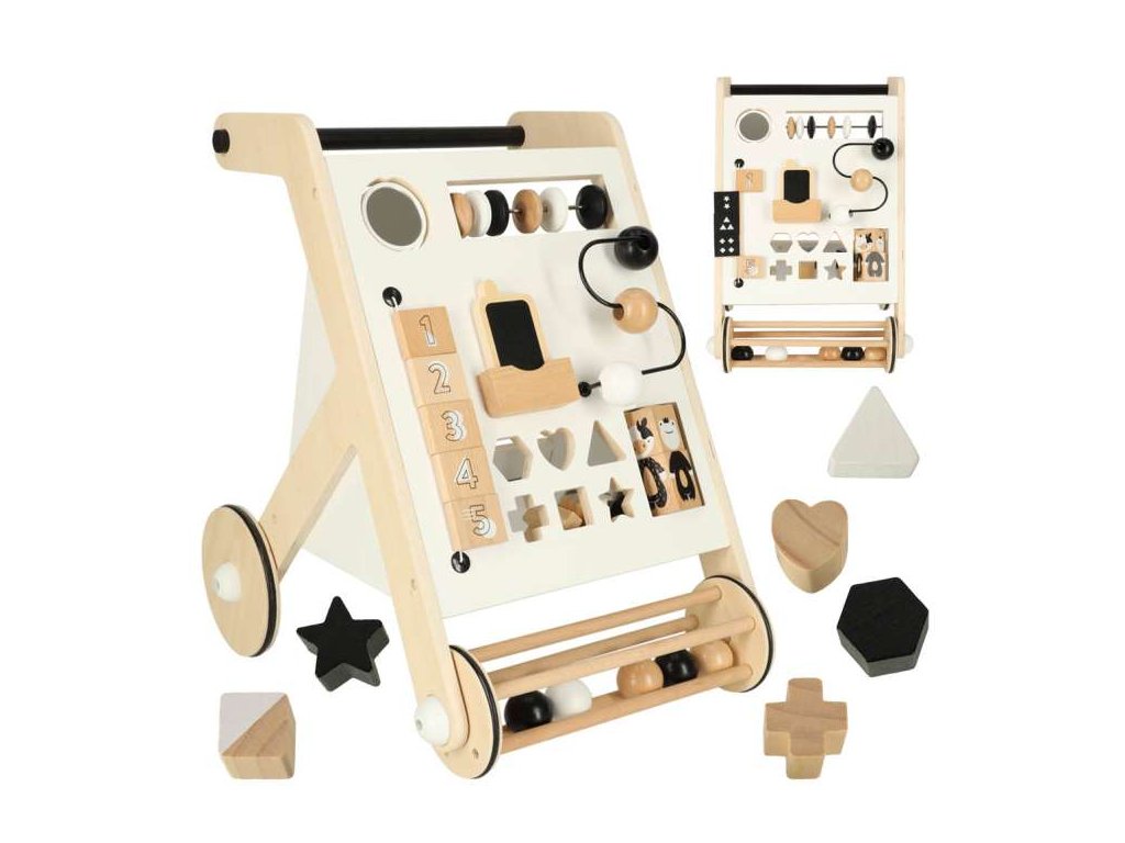 Der hölzerne Lauflernwagen verfügt über integrierte Lernspielzeuge, die Ihr Kind unterhalten, auch wenn es keine Lust auf weitere schwierige Schritte hat! Das Verschieben von Kugeln, das Anordnen von Kacheln mit Zahlen oder das Sortieren von Würfeln sind einfache Spiele, die viele Vorteile mit sich bringen! Sie ermöglichen die Förderung der manuellen Fähigkeiten des Kindes, insbesondere der Feinmotorik in Bezug auf die Finger- und Handarbeit.