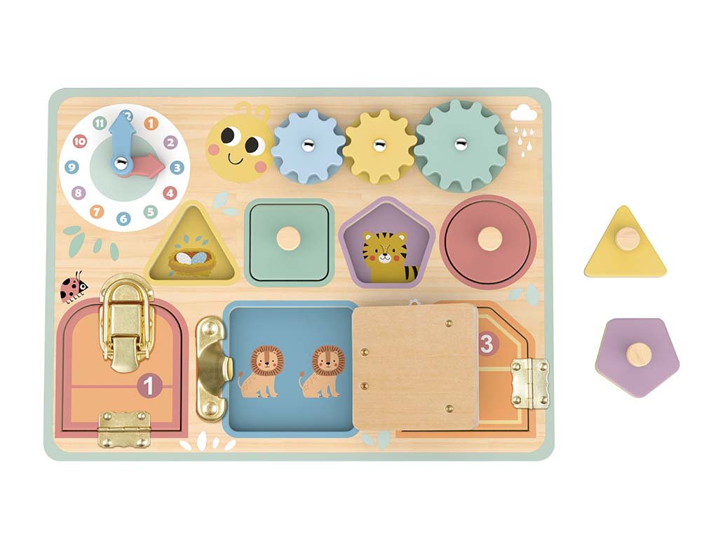 Das Brett bietet verschiedene Aktivitäten - vom Öffnen von Türen mit unterschiedlichen mechanischen Elementen über das Einlegen von Formen und das Erkennen von Farben bis hin zum spielerischen Erlernen der Uhrzeit. Jedes Element ist so gestaltet, dass es die Aufmerksamkeit des Kindes fesselt und gleichzeitig auf subtile Weise neue Fähigkeiten vermittelt.