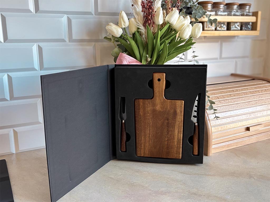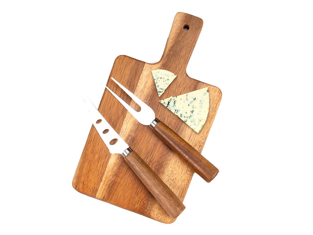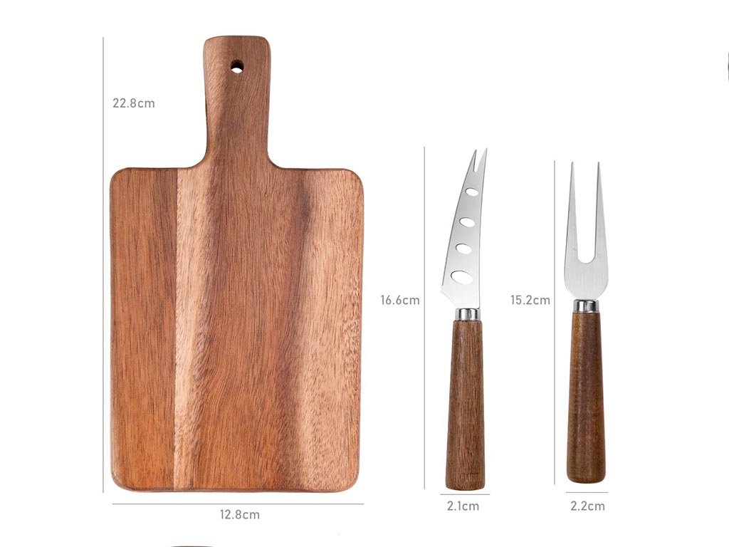 Speisen Sie stilvoll mit diesem Käsebrett aus hochwertigem Akazienholz. Das elegante Set beinhaltet ein Käsebrett mit Griff, eine Serviergabel und ein Käsemesser. Alles, was Sie benötigen, um Ihre Lieblingsspezialitäten perfekt zu präsentieren.