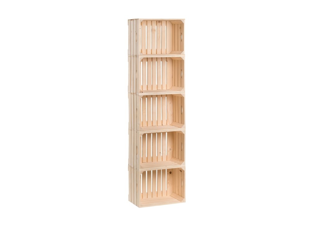 Dieses Holzregal besteht aus insgesamt 5 Kisten mit den Maßen 40 x 30 x 24 cm. Die Kistchen sind aus Kiefernholz gefertigt, das naturbelassen, d. h. geschliffen und glatt gehobelt ist.