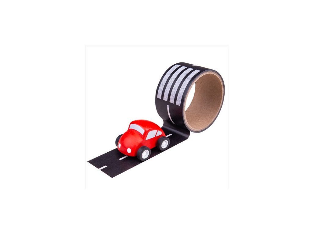 Gestalten Sie Straßen und Kreuzungen für Kinder nach ihren Wünschen. Zum Klebeband gehört auch ein Holzauto, mit dem kleine Abenteurer durch die entstandenen Straßen fahren können.