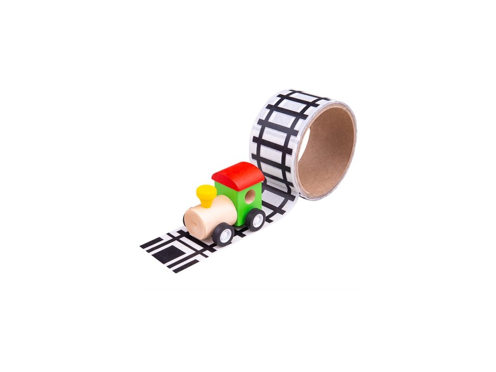 Gestalten Sie eine Eisenbahnstrecke für Ihre Kinder nach deren Wünschen. Zu dem Klebeband gehört auch eine Holzlokomotive, mit der kleine Abenteurer von Station zu Station fahren können.