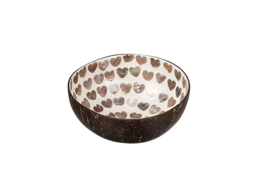 Die stilvoll lackierte Schale mit den Herzen im Inneren wird aus echter Kokosnuss hergestellt und ist das Ergebnis ehrlicher Handarbeit von Bali-Bauern.